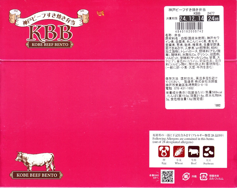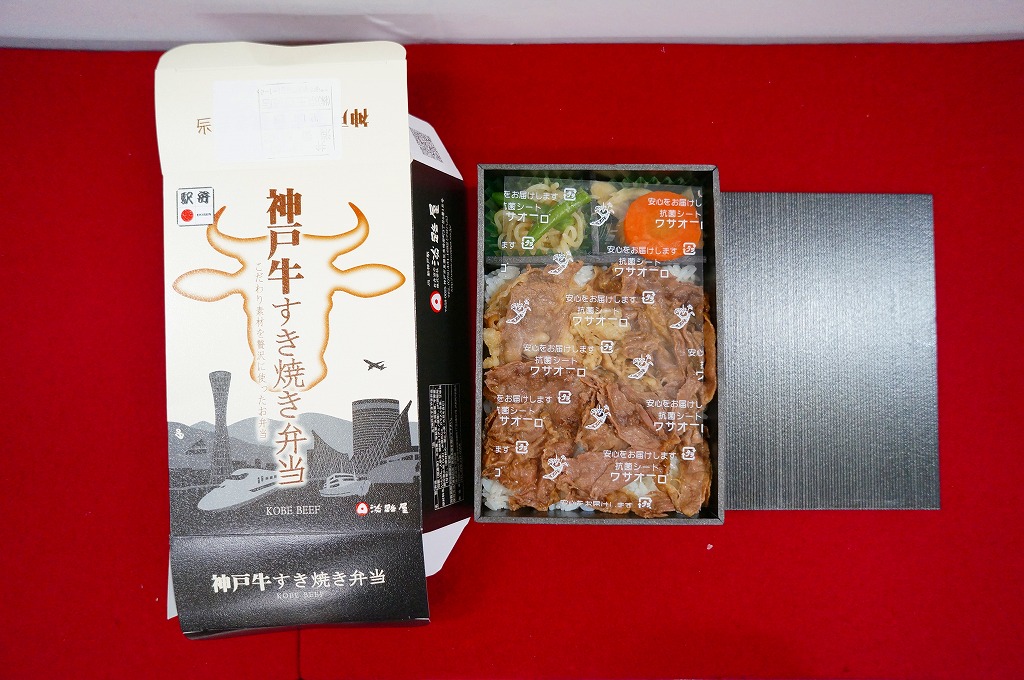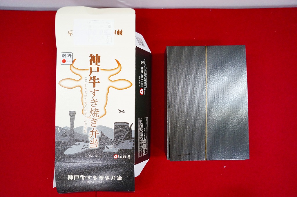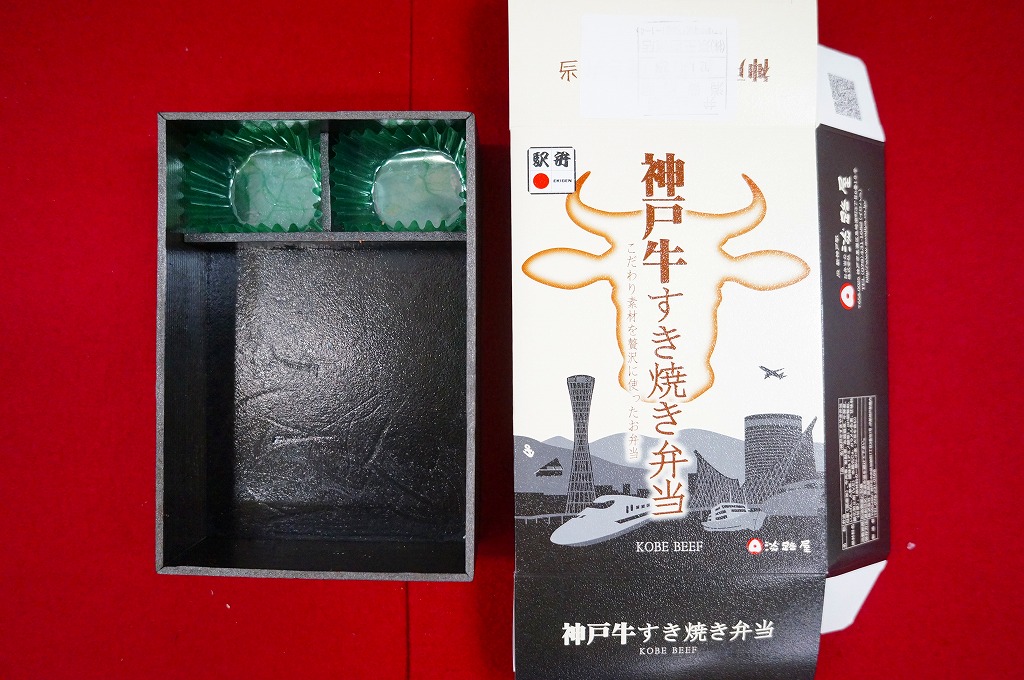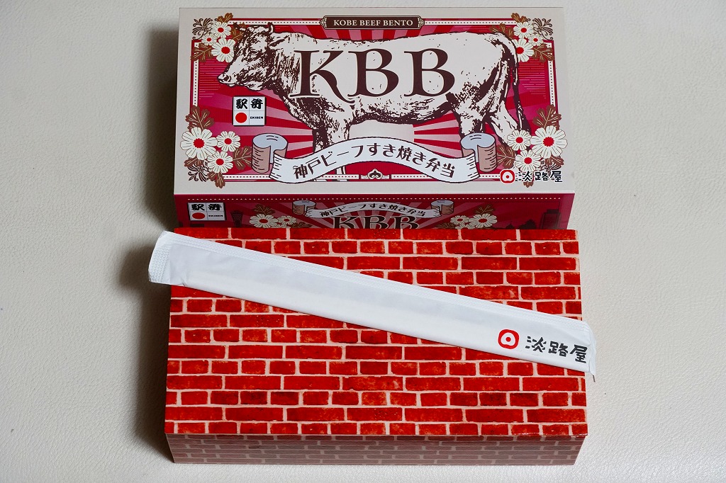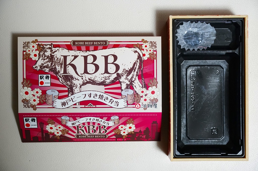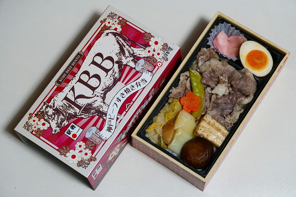 2024(令和6)年5月29日に調製元の直営店とオンラインショップで発売。牛に「KBB」記して旭日や花柄で彩った、スリーブのモダンな絵柄は、明治時代に主要な輸出品であったマッチの箱を模したデザインだという。長方形で煉瓦模様のプラ容器に白飯を敷き、神戸牛のワイン煮をベースとしたすき焼きで覆う。やや甘さを抑えたこだわりの調理法で仕上げたといい、食べ比べればそうなのかもしれないが、常温で普通においしく、肉の量もほどよいすきやき弁当だった。価格は2024年の発売時で1,480円、12月時点で1,580円。