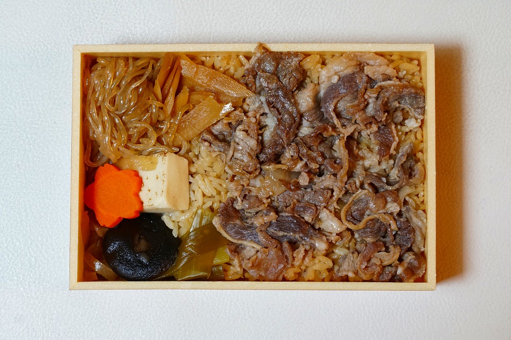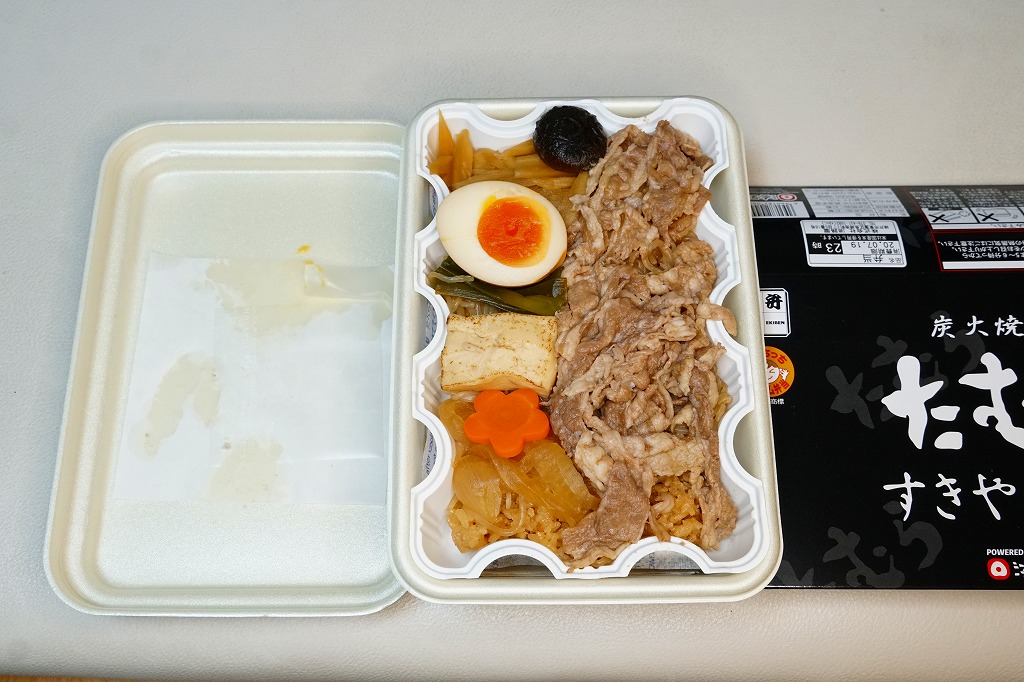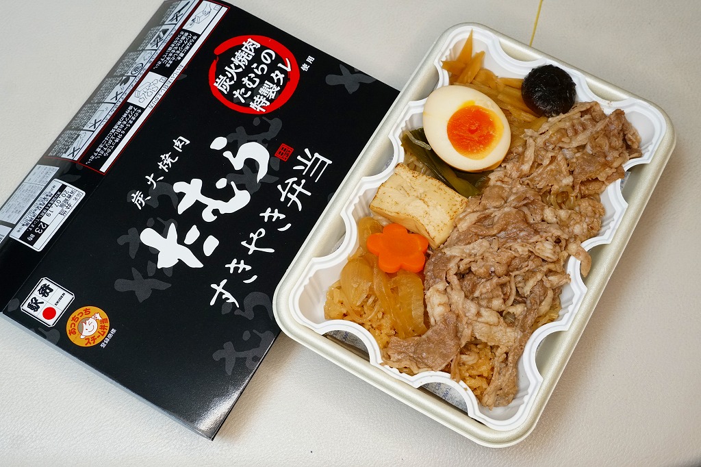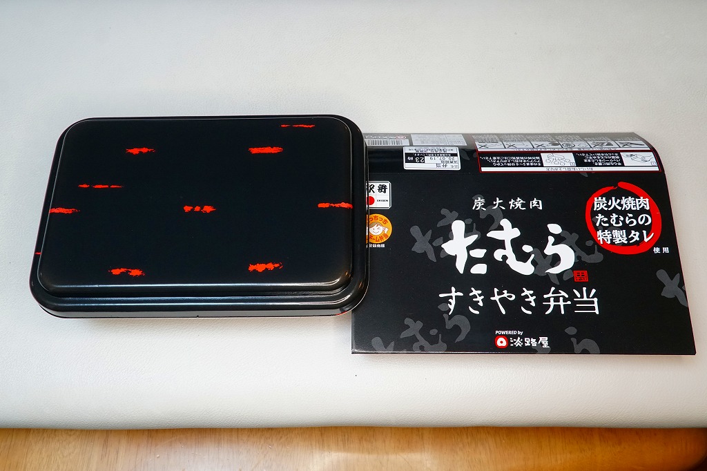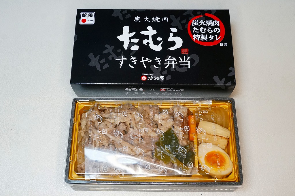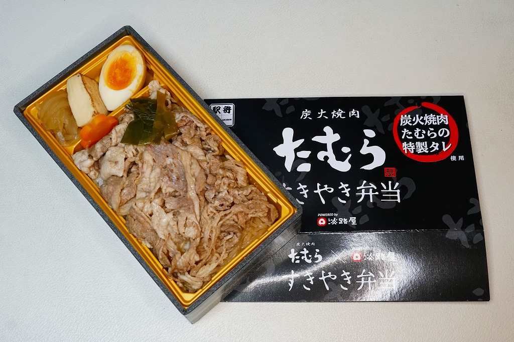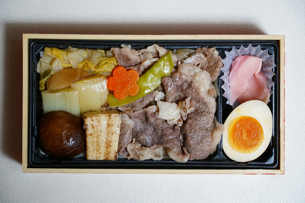 焼肉店のロゴと黒い色をしたスリーブに収めた黒い容器に、味付き飯を詰め、糸こんにゃくを敷いて牛肉煮で覆い、半身の煮玉子、ネギ炒めとタマネギ炒め、ニンジン、焼き豆腐を添える。関西でよく知られた名前を持つ、駅弁屋が常温向けにカスタマイズしたすき焼き弁当。2020年内までの販売か。