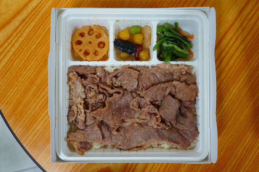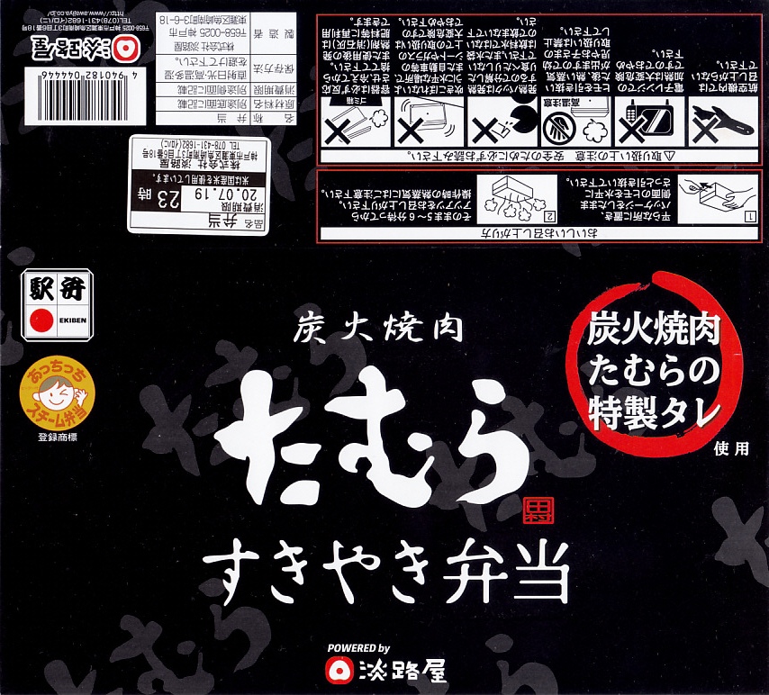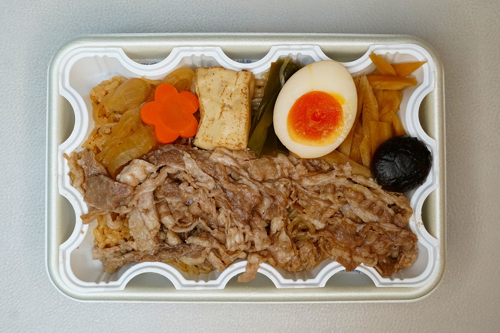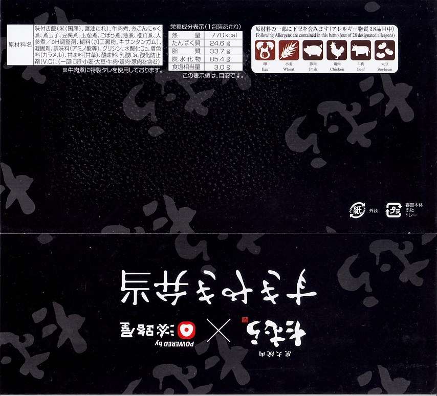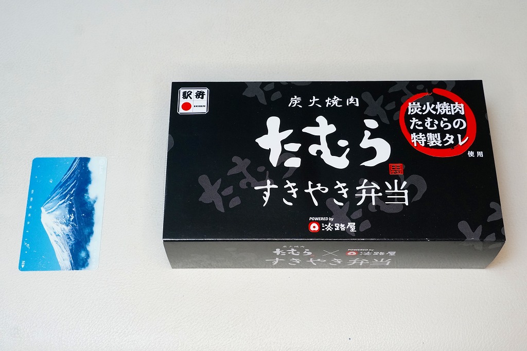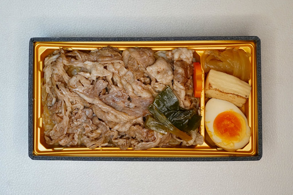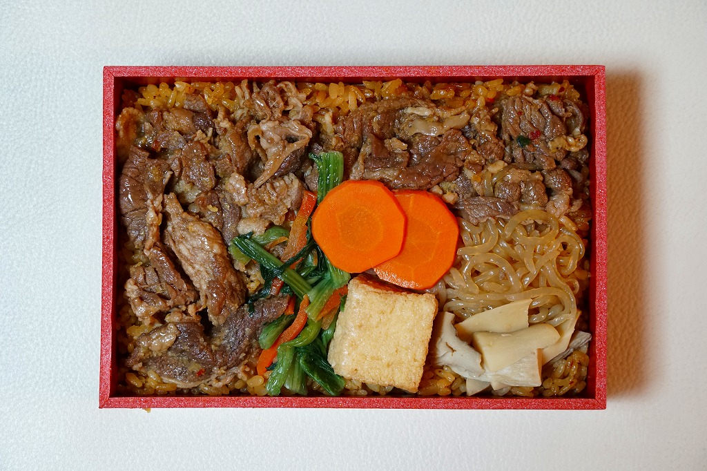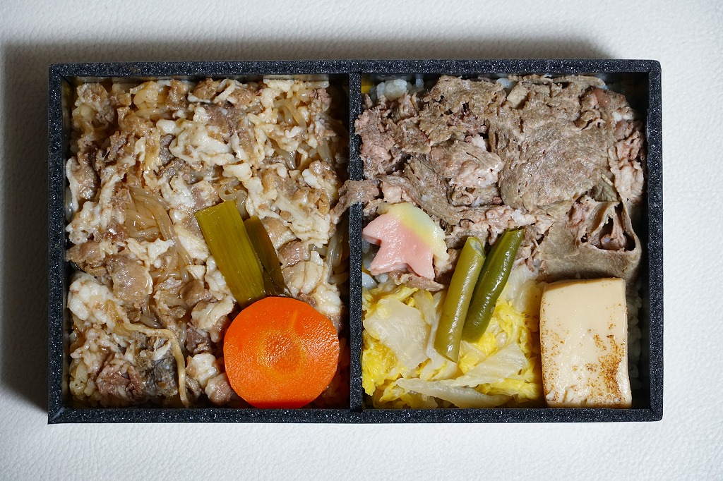 焼肉店のロゴと黒い色をしたスリーブに収めた黒い容器に、味付き飯を詰め、糸こんにゃくを敷いて牛肉煮で覆い、半身の煮玉子、ネギ炒めとタマネギ炒め、ニンジン、焼き豆腐を添える。関西でよく知られた名前を持つ、駅弁屋が常温向けにカスタマイズしたすき焼き弁当。2020年内までの販売か。