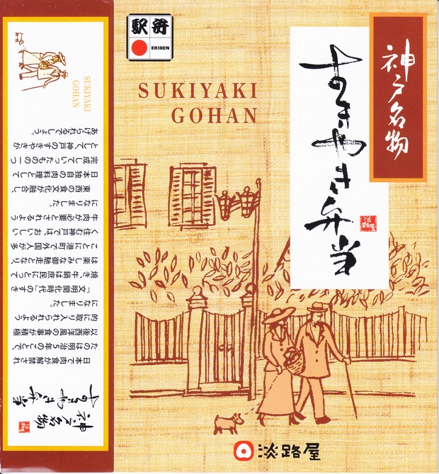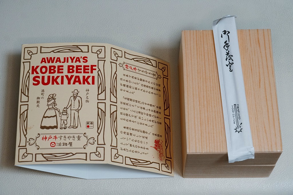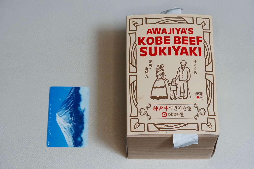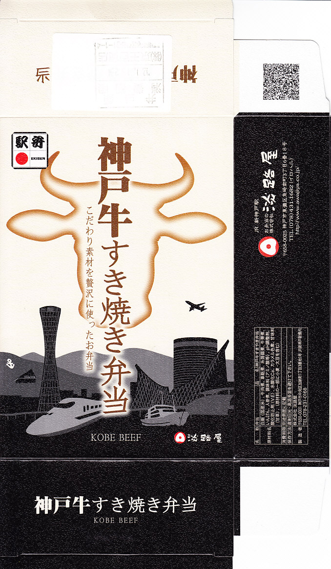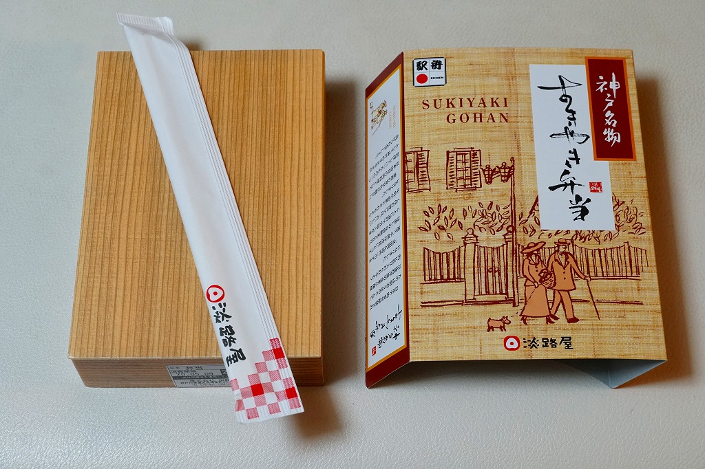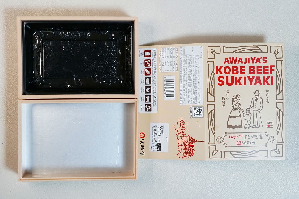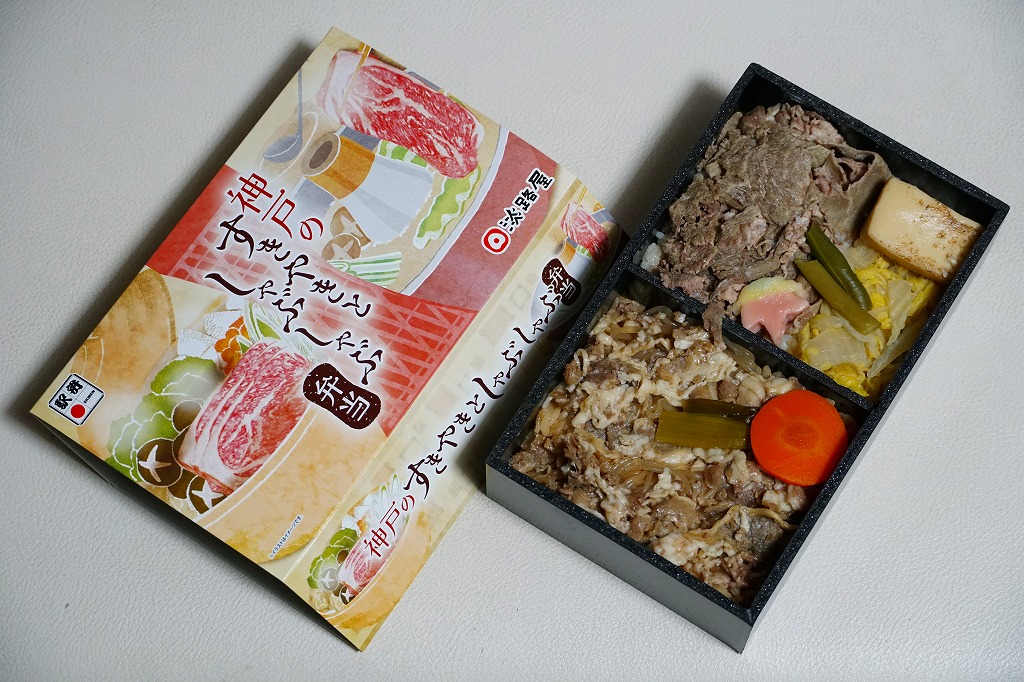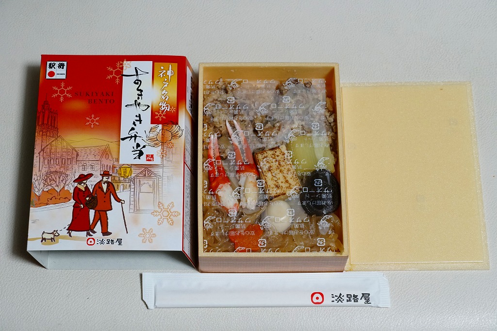 昭和時代から何度も何度も出続ける、新神戸駅弁のすきやき弁当の、2023年時点での姿のひとつ。この容器と内容では、2022年1月までに発売か。2023年1月までに絵柄を変えたスリーブには、赤い太字で大きく「AWAJIYA’S KOBE BEEF SUKIYAKI」と書かれ、これが駅弁の名前のようにも見える。ふたつ重ねた長方形の容器の、下段にきのこピラフを詰め、上段に神戸牛すきやきを、牛肉、糸こんにゃく、とうふ、ごぼう、白菜、たまねぎ、しいたけ、ねぎ、にんじんの煮物を詰める。常温でいただける、水気のある牛すき焼き。温めればもっと、おいしくなりそう。