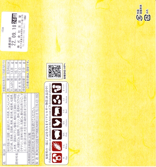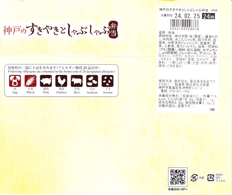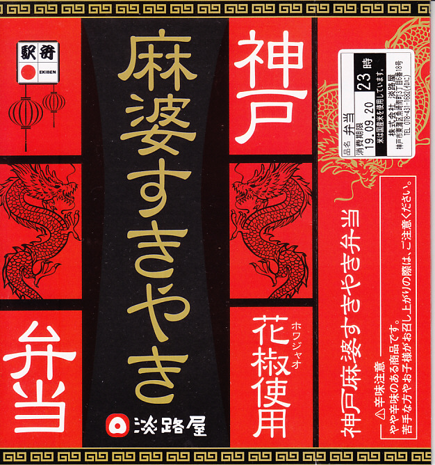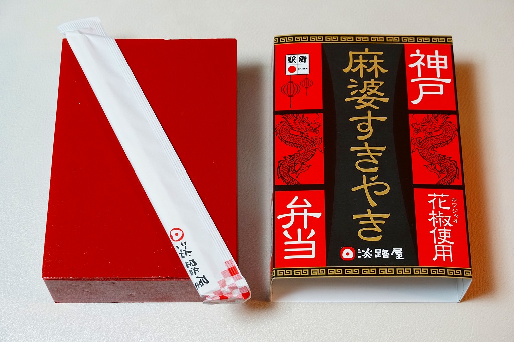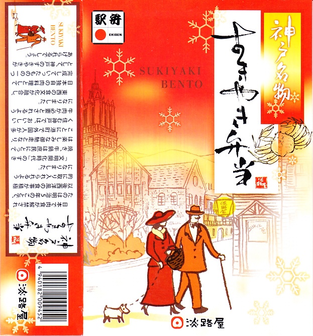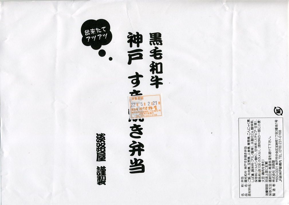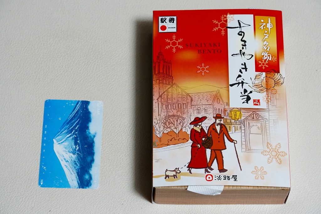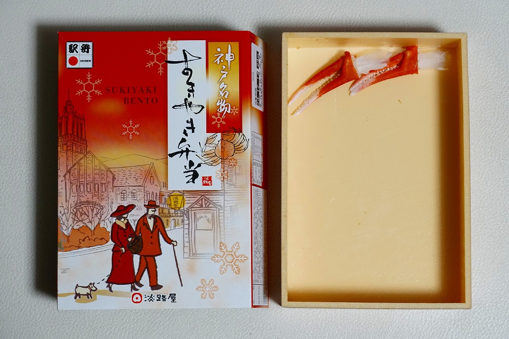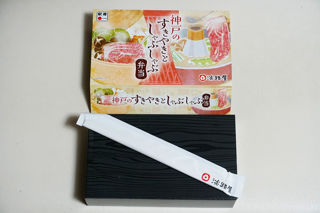 昭和時代から何度も何度も出続ける、新神戸駅弁のすきやき弁当の、2023年時点での姿のひとつ。この容器と内容では、2022年1月までに発売か。2023年1月までに絵柄を変えたスリーブには、赤い太字で大きく「AWAJIYA’S KOBE BEEF SUKIYAKI」と書かれ、これが駅弁の名前のようにも見える。ふたつ重ねた長方形の容器の、下段にきのこピラフを詰め、上段に神戸牛すきやきを、牛肉、糸こんにゃく、とうふ、ごぼう、白菜、たまねぎ、しいたけ、ねぎ、にんじんの煮物を詰める。常温でいただける、水気のある牛すき焼き。温めればもっと、おいしくなりそう。