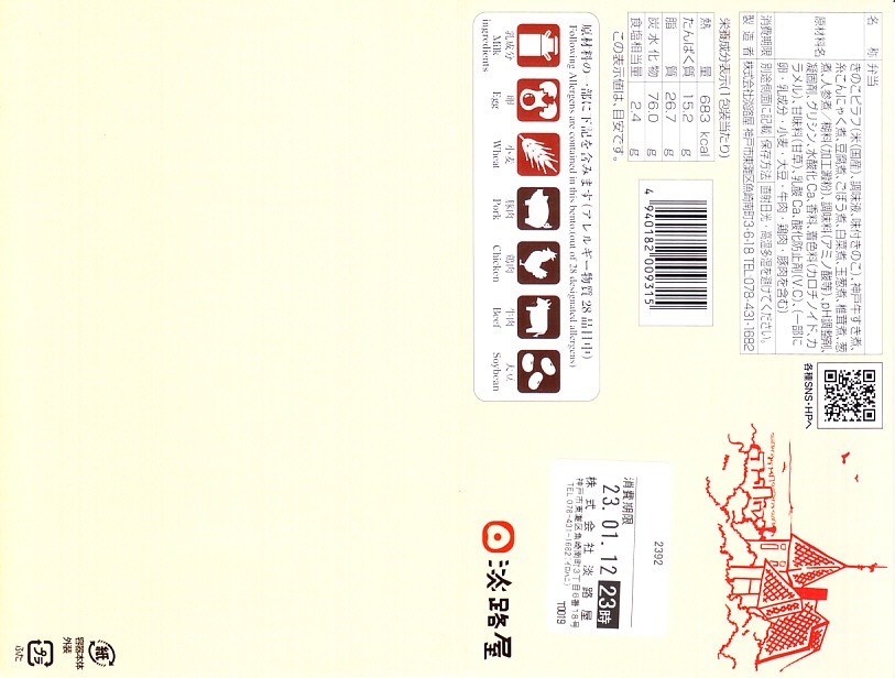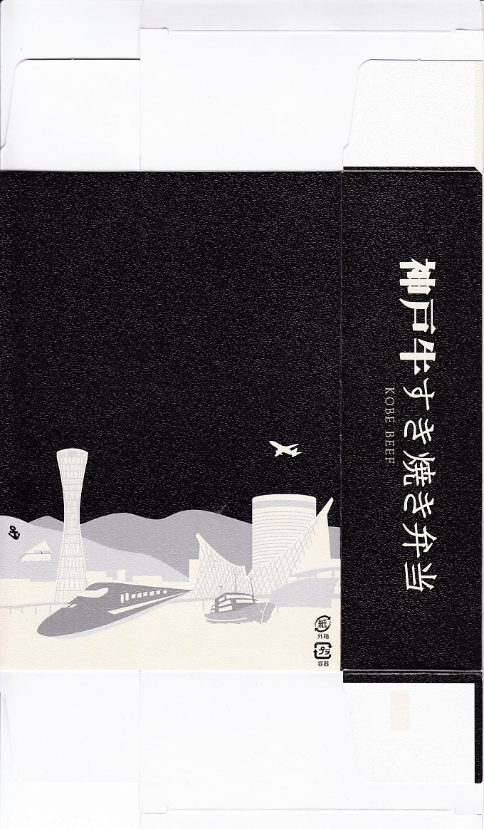 秋冬の駅弁大会シーズンに向けた、2023(令和5)年秋の新商品。淡い絵柄のスリーブには、神戸ポートタワーとすきやきとしゃぶしゃぶを描く。黒い長方形の容器の2区画に味付飯を詰め、一方を牛肉と白菜と豆腐の煮物で覆いインゲンとお麩で彩り、他方を茹で牛肉と糸こんにゃくで覆いネギとにんじんで彩る。見た目も内容も、すきやきとしゃぶしゃぶの組合せ。神戸の駅弁を昔から知りすぎていると、すき焼きなのに加熱機能付き容器でない、しゃぶしゃぶなのに冷しゃぶの高額駅弁でない、と昭和時代の先進事例での固定観念が邪魔をして、謎の駅弁に見える。