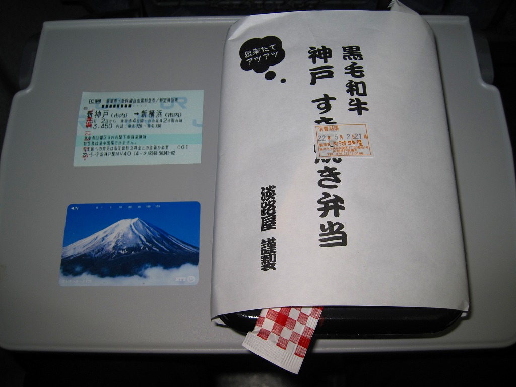 下記の新神戸駅限定の注文販売駅弁「黒毛和牛神戸すき焼き弁当」を、2011(平成23)年の秋までにリニューアルか。これは京王百貨店の駅弁大会での実演販売で購入したもの。真っ黒な長方形の容器を、神戸や牛にちなむ絵柄をいろいろ描いたボール紙の箱に詰める。中身は白御飯に牛肉煮を載せ、ニンジン、ごぼう、インゲン、糸こんにゃくを添えるもの。牛肉は薄く引き延ばされた感じで、そのためにジューシーでビーフの香りが感じられる。現地で買った前作とは違い、これは見ても食べてもうまい。価格は2012年の購入時で1,300円、2014年4月の消費税率改定で1,330円。2017年までの販売か。