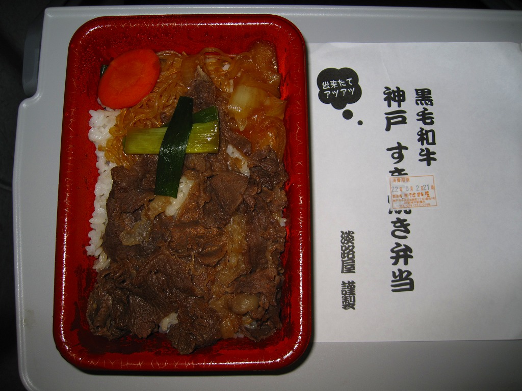 掛紙でも販売員からも一押しされたとおり、確かに出来たてでアツアツなのだが、中身は暖かいだけであまり美味いとは思えない牛丼だった。この調製元の「肉めし」その他の常温駅弁での牛肉の旨さを考えると、掛紙のデザインや容器の選定ともども、駅弁屋の実力が出ていない駅弁だと思う。2011年までに上記の「神戸牛すきやき弁当」(1,300円)へリニューアルされた模様。