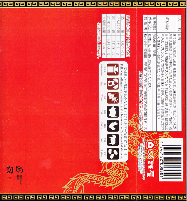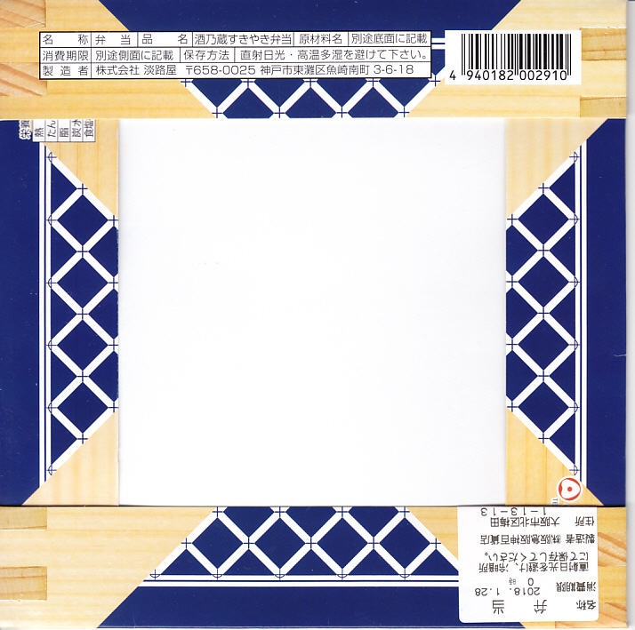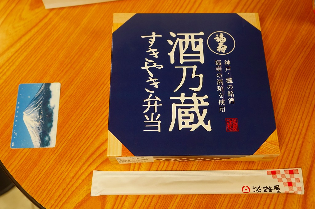 2018(平成30)年1月1日の発売。同月の京王百貨店の駅弁大会でデビューした下記の駅弁「酒乃蔵牛肉弁当」の親戚かと思ったら、調製元のフェイスブックによると「昨夏に発売した商品をグレードアップ」だそうで、こちらが先だった。神戸・灘の銘酒「福寿」の酒粕の使用を共通に、こちらは駅弁の名前のとおり白飯を牛すき焼き肉で覆い、れんこん、煮豆、和え物の付合せ。こういう味が今の関西でうけているのかと思ったら、この日の満員の催事場では客が付いていなかった。駅でも売られたが、半年以内に売り止めたと思われる。