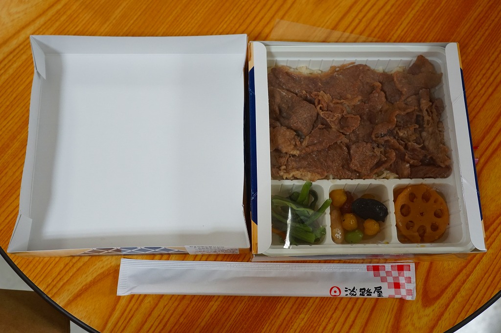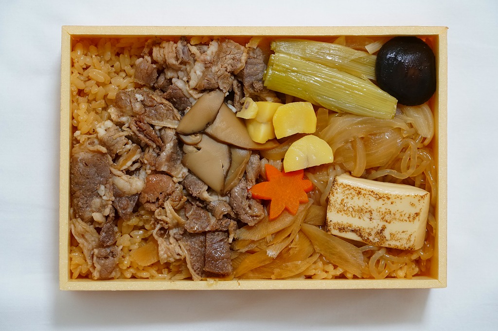 この姿と名前では、2018(平成30)年9月の発売。1988(昭和63)年の発売で、ひもを引くと温まる「あっちっちすきやき御飯」の、30年の時を経て出てきた常温版。味付き飯を、牛肉、糸こんにゃく、ごぼう、豆腐、タマネギ、シイタケ、ネギ、ニンジンの煮物、つまり牛すき焼きで覆うもの。漬物などの付合せを中身にも別添にも持たない、すきやき弁当だけの駅弁は、珍しいかもしれない。玉子は入らない。価格は2020年の購入時で950円、2022年3月から980円。