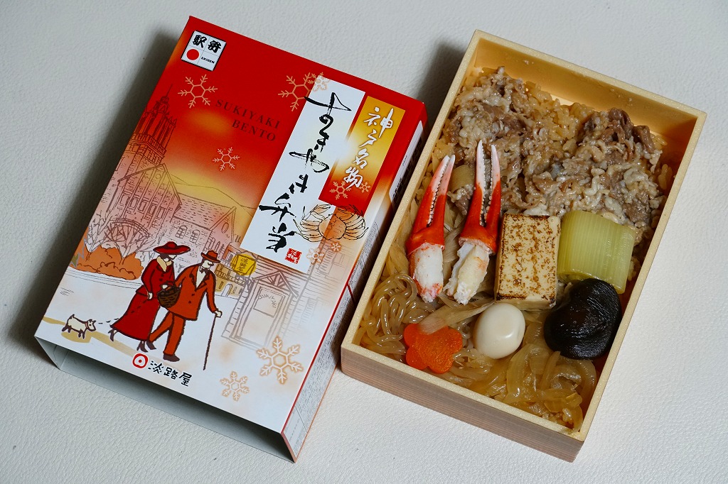 この姿と名前では、2022(令和4)年12月の発売か。駅弁催事での商品名は「冬のすきやき弁当」であり、下記の駅弁「神戸名物すきやき弁当」を四季の駅弁に変えたものだと思われる。スリーブの絵柄と宣伝文は従前を踏襲し、雪の結晶とカニと、冬らしい絵柄を加えた。