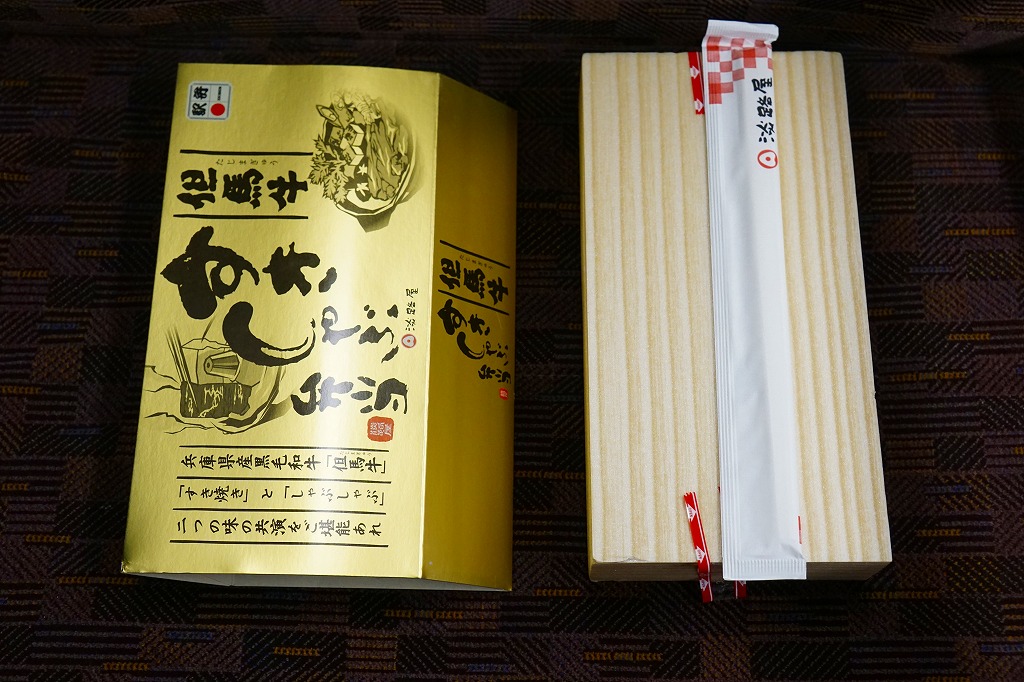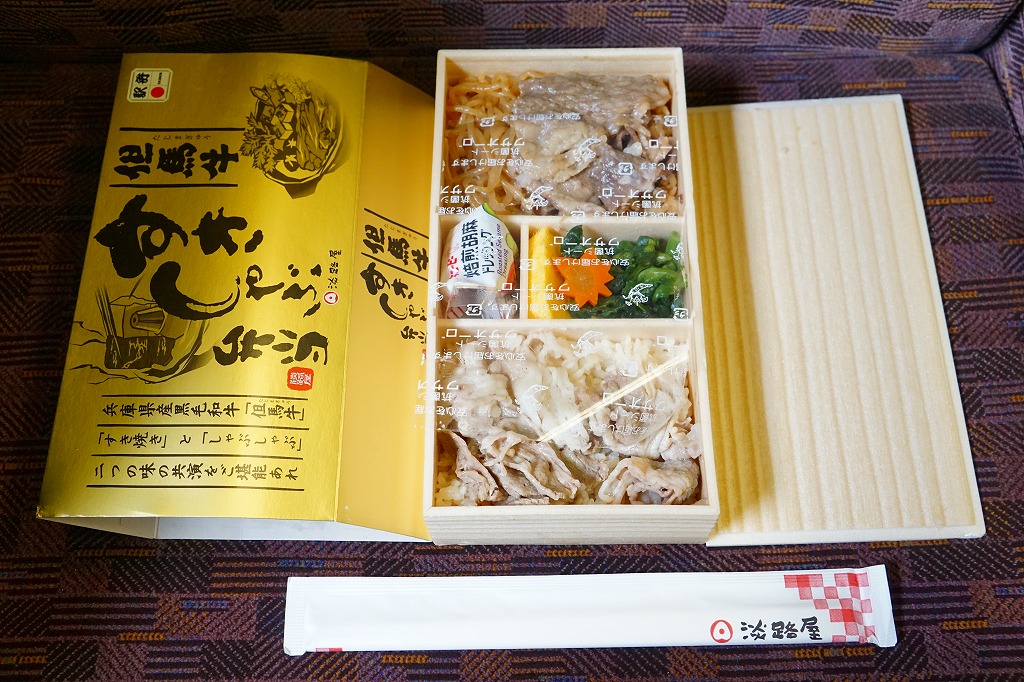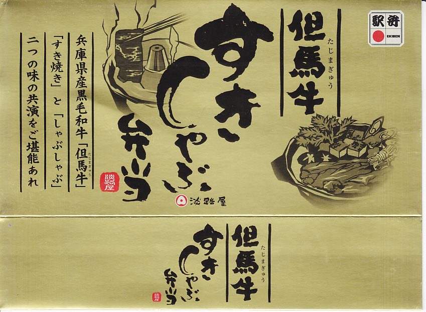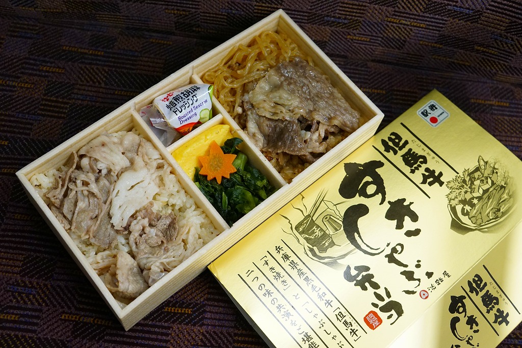 2013(平成25)年10月に1,200円で発売。駅弁の名前のとおり、但馬牛のしゃぶしゃぶ弁当と、但馬牛のすき焼き弁当の詰め合わせ。容器の左側で白飯を薄手の牛肉煮で覆い、右側で白飯を左より厚手の牛肉煮と糸こんにゃくで覆い、真ん中に菜の花と玉子焼とニンジンとドレッシングを据える。2015年の初頭までの販売か。