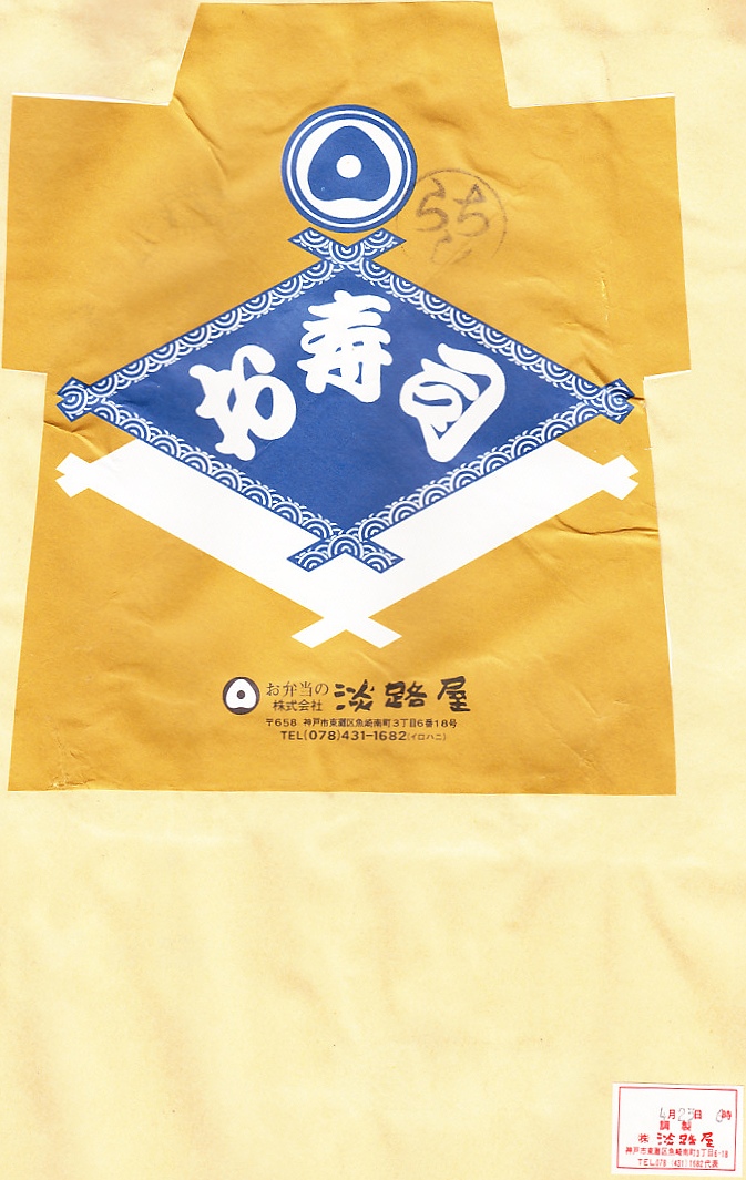 入手状況から1994(平成6)年4月23日6時の調製と思われる、昔の新神戸駅弁の掛紙の一部。絵柄はまるで昭和中期。この調製元の名称に駅名が併記されていないため、駅弁でなく市販か仕出しの弁当向けの掛紙かもしれない。