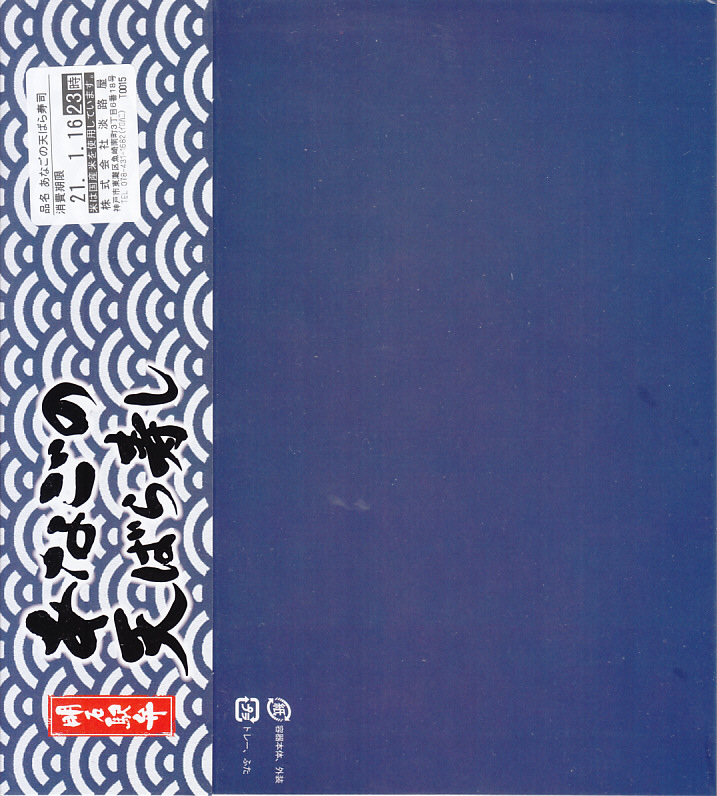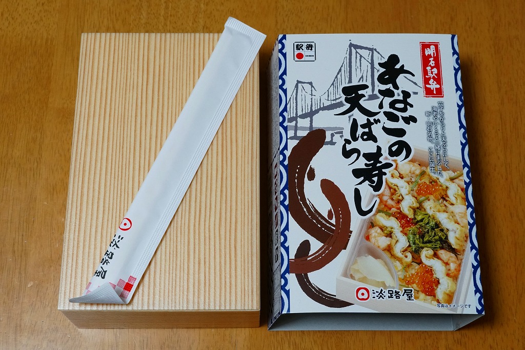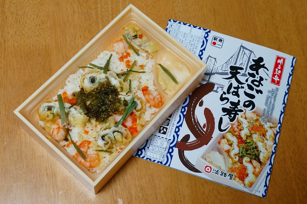 2021(令和3)年1月の京王百貨店の駅弁大会で輸送販売。「たこの天ばら寿し」と同時に発売か。明石海峡大橋とは明らかに異なる吊り橋とアナゴと中身の写真を印刷したスリーブには「明石駅弁」と書いてあり、しかしJR明石駅や山陽明石駅では駅弁は売られていないはずで、催事の駅弁リストでは西明石駅の駅弁としていた。中身は酢飯にアナゴ天とエビ煮を散らし、イクラ、焼き海苔、山菜で彩り、甘酢生姜を添えるもの。酢飯と常温により、風味が独特な天丼。2022年までの販売か。