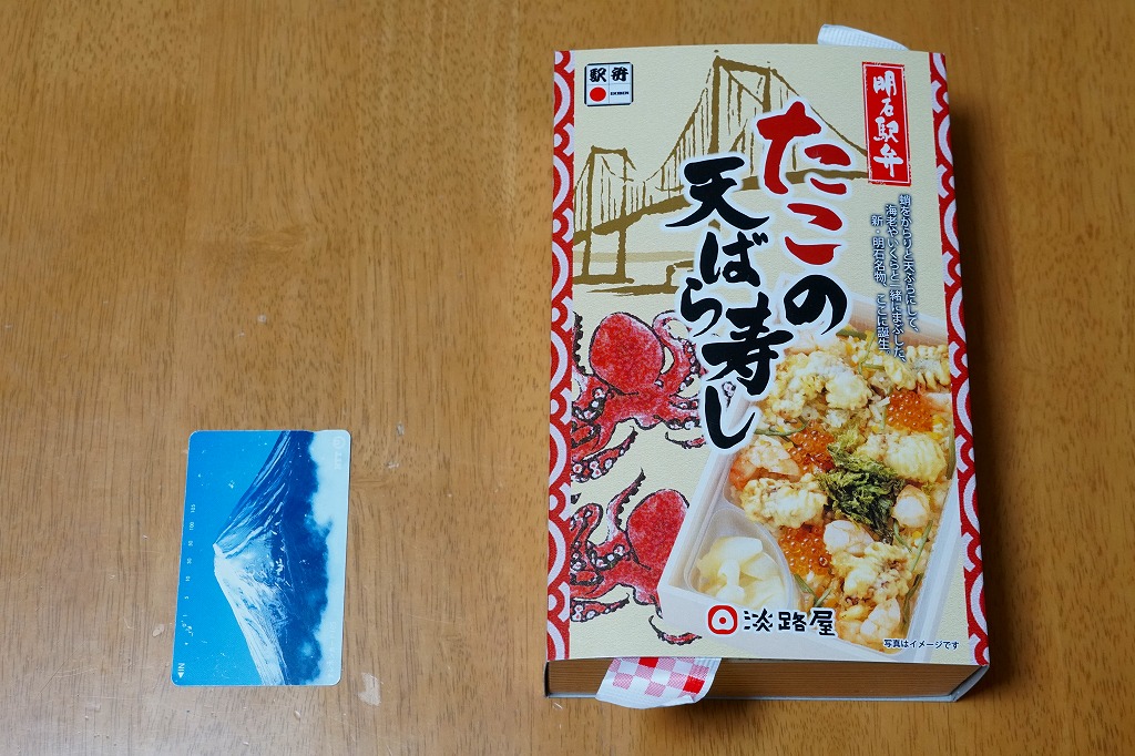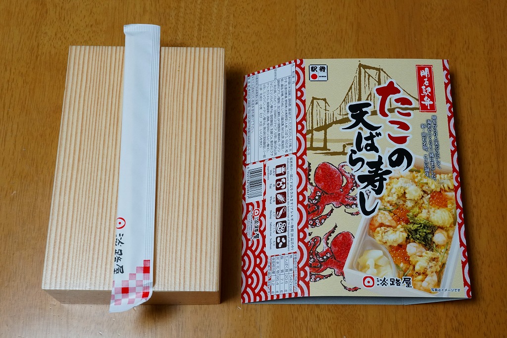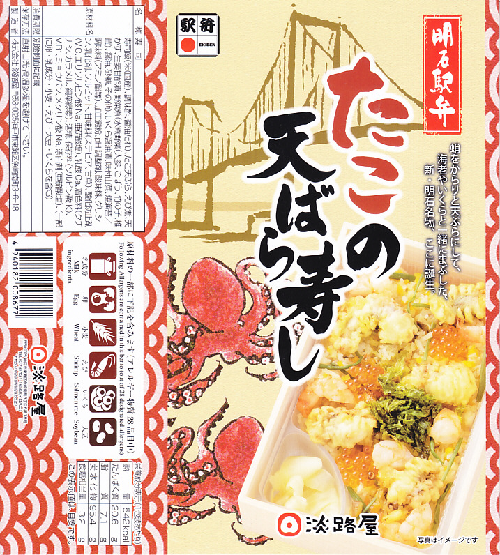 2021(令和3)年1月の京王百貨店の駅弁大会で輸送販売。「あなごの天ばら寿し」と同時に発売か。明石海峡大橋とは明らかに異なる吊り橋とタコと中身の写真を印刷したスリーブには「明石駅弁」と書いてあり、しかしJR明石駅や山陽明石駅では駅弁は売られていないはずで、催事の駅弁リストでは西明石駅の駅弁としていた。中身は酢飯にタコ天とエビ煮を散らし、イクラ、焼き海苔、山菜で彩り、甘酢生姜を添えるもの。酢飯と常温により、風味が独特な天丼。京王以外で売られたかは不詳。