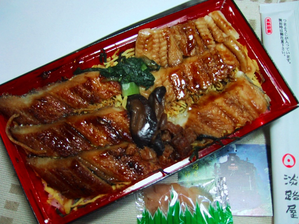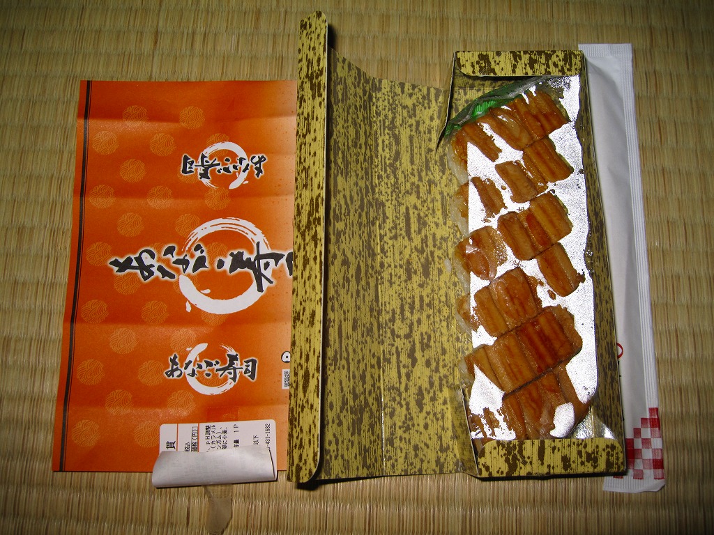 竹皮を模したボール紙の箱に、商品名だけを書いた橙色の掛紙を巻く。中身は箱に直接、バッテラ型の柔らか煮穴子を6切れ収めるもの。宮島口や高松や姫路などと異なり、神戸駅弁の穴子寿司は評判が聞かれず、そもそも紹介例や収穫報告さえ見られないところだが、味はなかなか負けていない。現在は販売されていない模様。