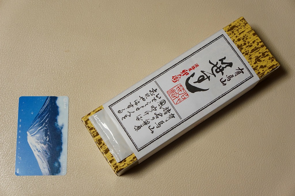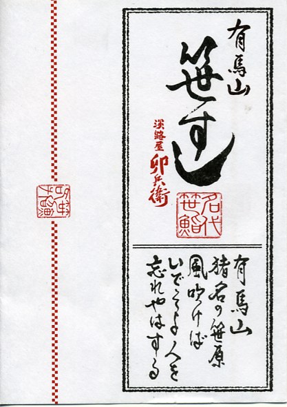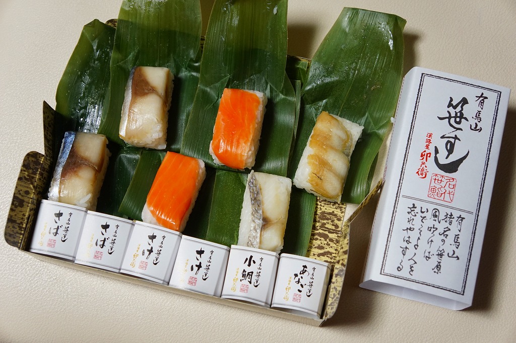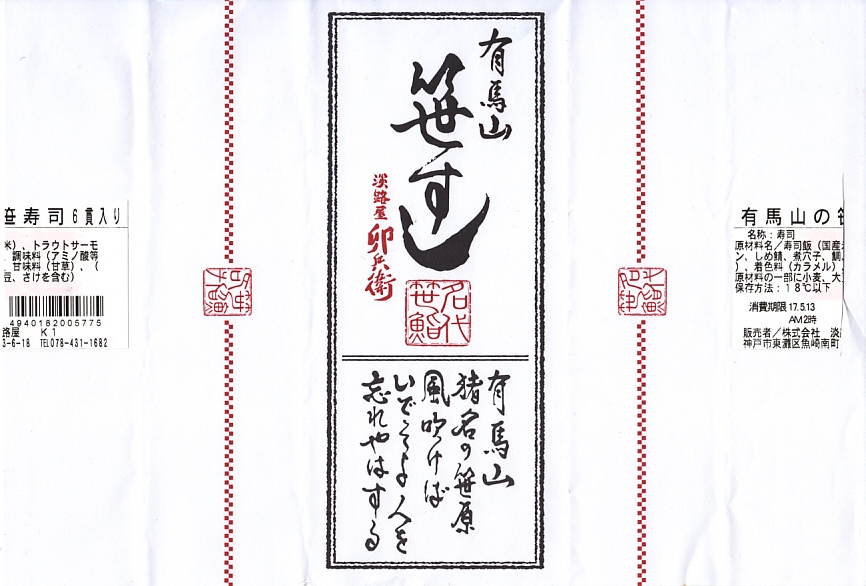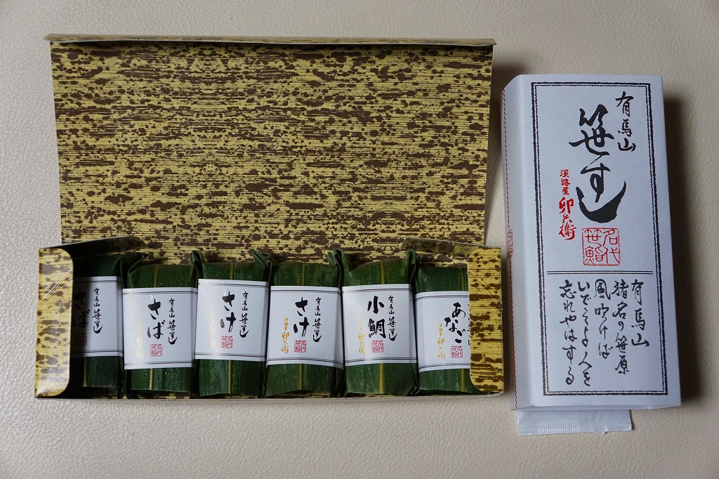 2008(平成20)年までに発売か。竹皮を模したボール紙の箱の中に、中身を書いた紙帯を締めた笹巻きのブロックが6個並ぶ。中身はあなごが1個、小鯛が1個、さけが2個、さばが2個、きゅっときっちり詰まった握り寿司タイプの押寿司がそれぞれに収まるもの。分量はとてもとても少ない。柿の葉寿司の地域で笹寿司とは、珍しいのではないかと思う。2017年までの販売か。