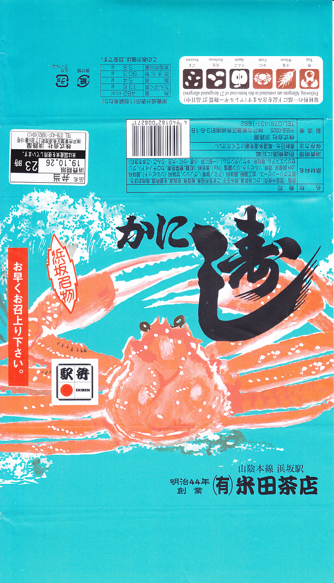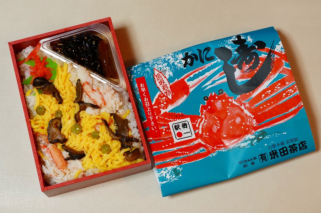 2019(平成31)年4月10日の発売。昭和時代から兵庫県の山陰本線浜坂駅で駅弁として売られ、調製元の駅弁撤退後も駅前商店で売られ、この年の1月で廃業により終売となった名物駅弁を、神戸の駅弁屋が継承し復刻した。掛紙の絵柄は浜坂駅弁を踏襲、酢飯をカニの酢漬けのほぐし身や錦糸卵やシイタケやグリーンピースで覆い、紅生姜と昆布佃煮と奈良漬を添える中身も、やはり浜坂駅弁を踏襲した。容器は踏襲されなかったほか、風味も現地の当時とはなんとなく異なるような気はした。価格は2019年の発売時や購入時で1,100円、2022年3月から1,150円、2023年時点で1,200円。
