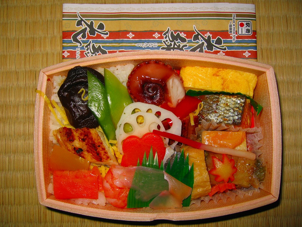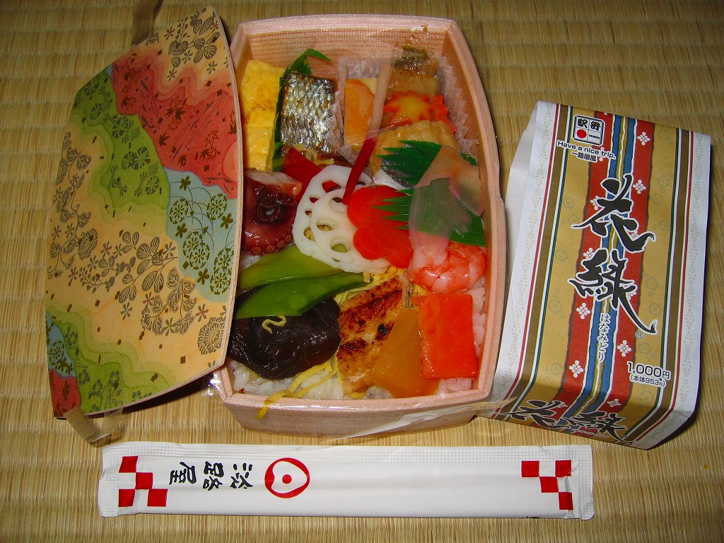 2007(平成19)年1月12日に発売か。樽の断面型な容器は、装飾付きのふたが枠にきれいにはまり、これに駅弁の名前を書いた掛紙を巻いてテープで留める。中身は酢飯をほどほどに詰め、その上と横に玉子焼、鮭みそ漬、タコ旨煮、はじかみ生姜、煮穴子、椎茸など19種類もの具を添えるもの。