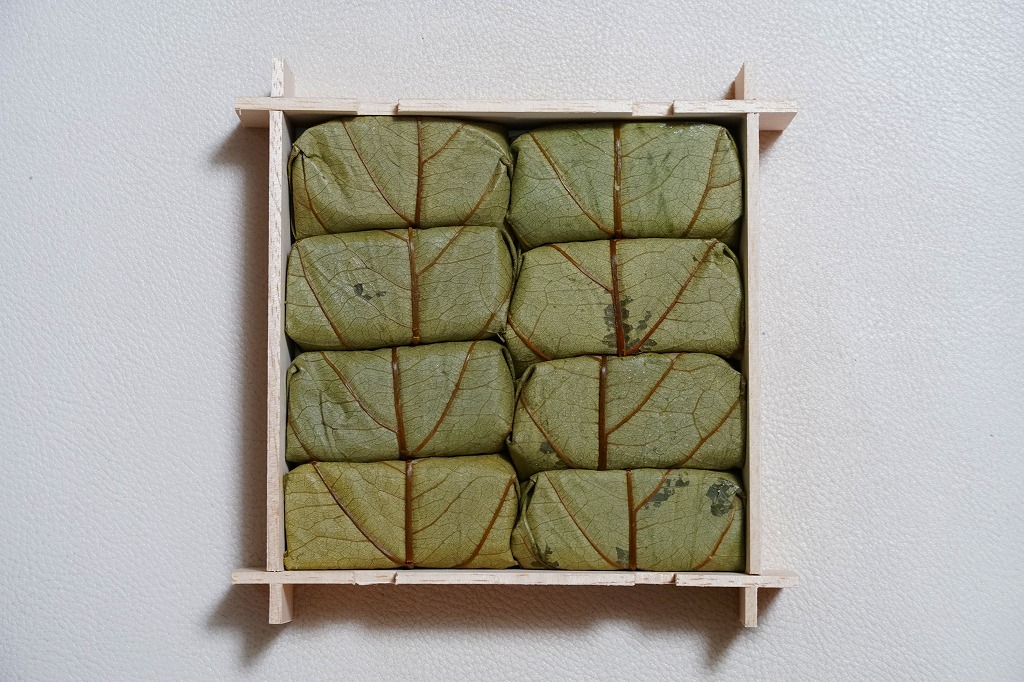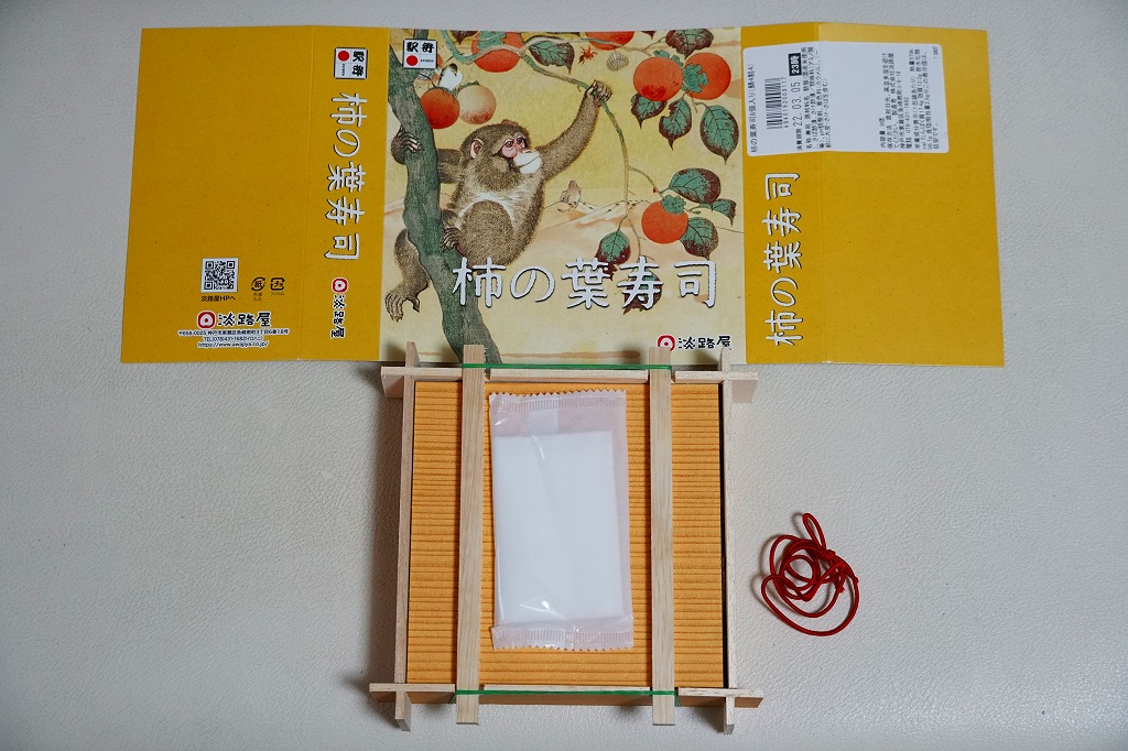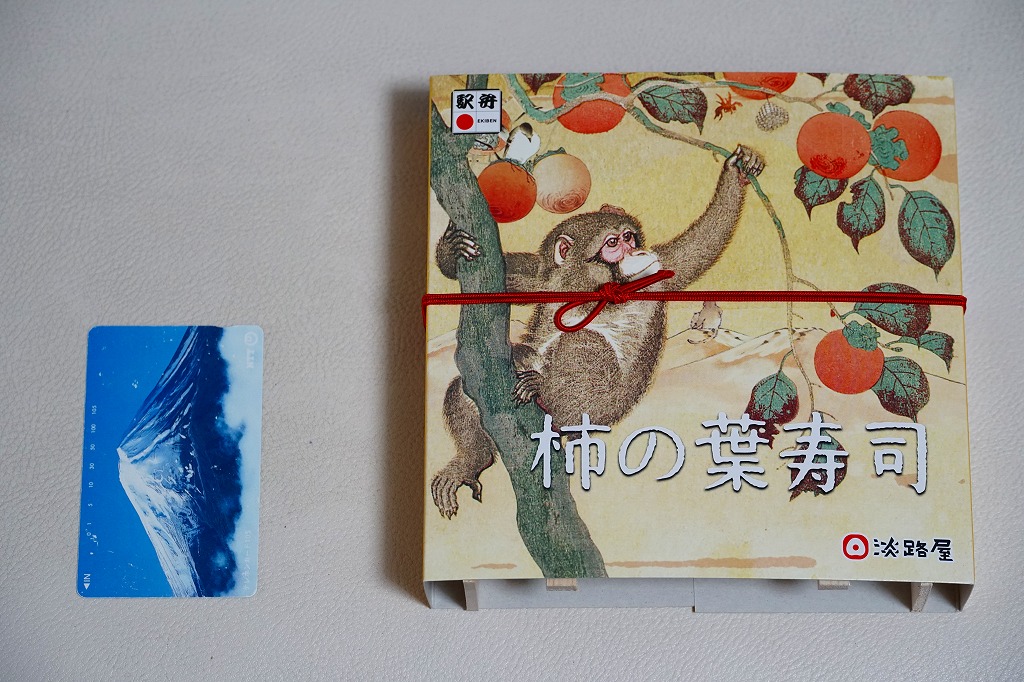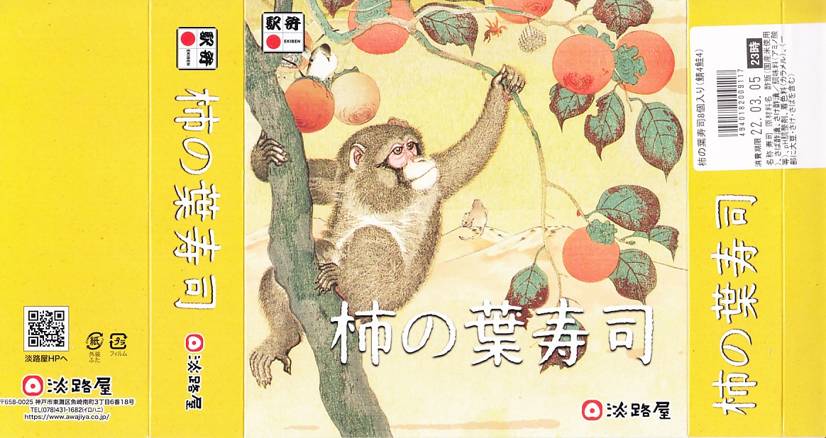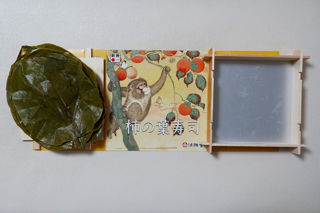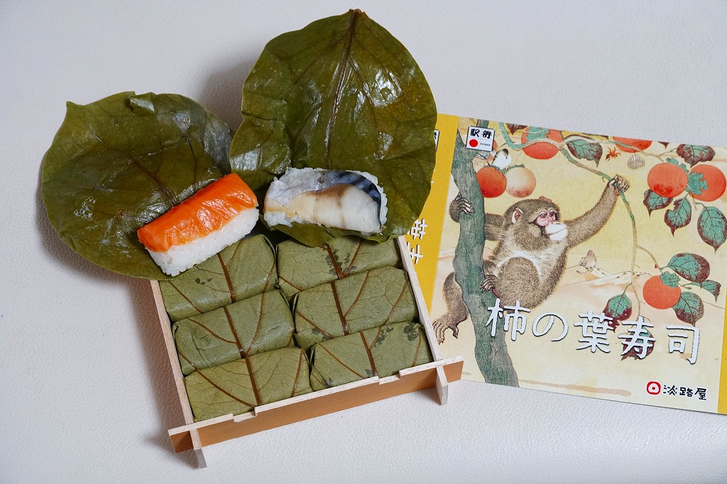 この姿と名前では、2021(令和3)年の11月に発売。小さな酢飯にさけを貼り、柿の葉で包んだものを4個、同じくさばのものを4個、箱詰めしてスリーブに収める、ごく普通の柿の葉寿司。味もつくりも見た目も、落ち着きのある感じ。「柿の木と猿」と題された、ふたのイラストが印象的。