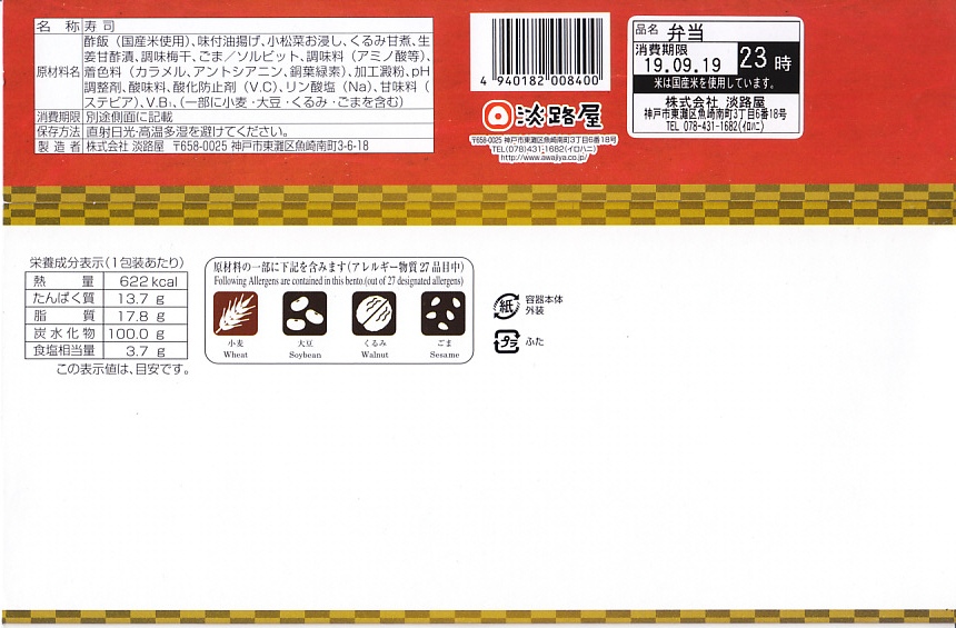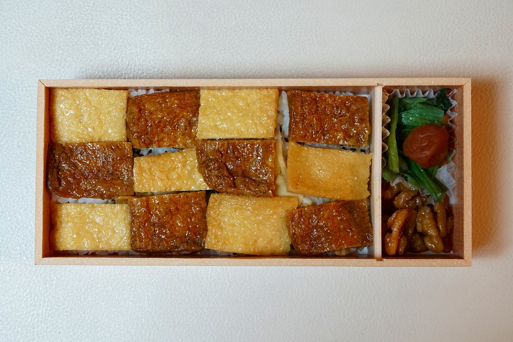 2019(令和元)年7月27日の発売。長方形の容器に詰めたゴマ御飯を、四角く刻んだ濃淡の油揚げで市松模様に覆い、クルミ、小松菜、梅干しを添付。これはなかなかのアイデア商品。おかずのない弁当なのに、稲荷寿司のようにそのまま食べられる。