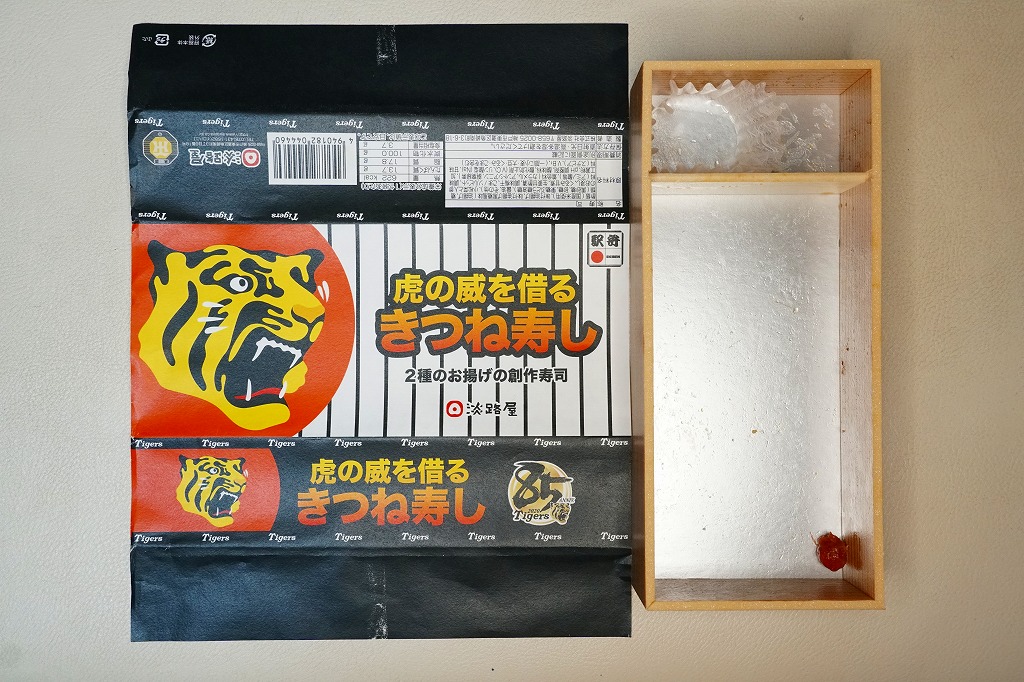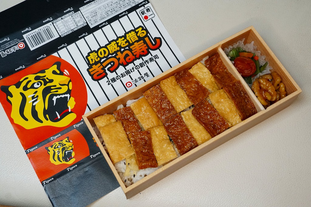 中身は「二種のお揚げのきつね寿し」と同じで、長方形の容器に詰めたゴマ御飯を、四角く刻んだ濃淡の油揚げで覆い、クルミ、小松菜、梅干しを添付するもの。飯の覆い方を、市松模様からタイガースのユニフォームにある縦縞模様にして、球団を応援した。掛紙にもちゃんと、黒と白の縦縞模様がある。8月または7月で売り止めてしまったように見える。
