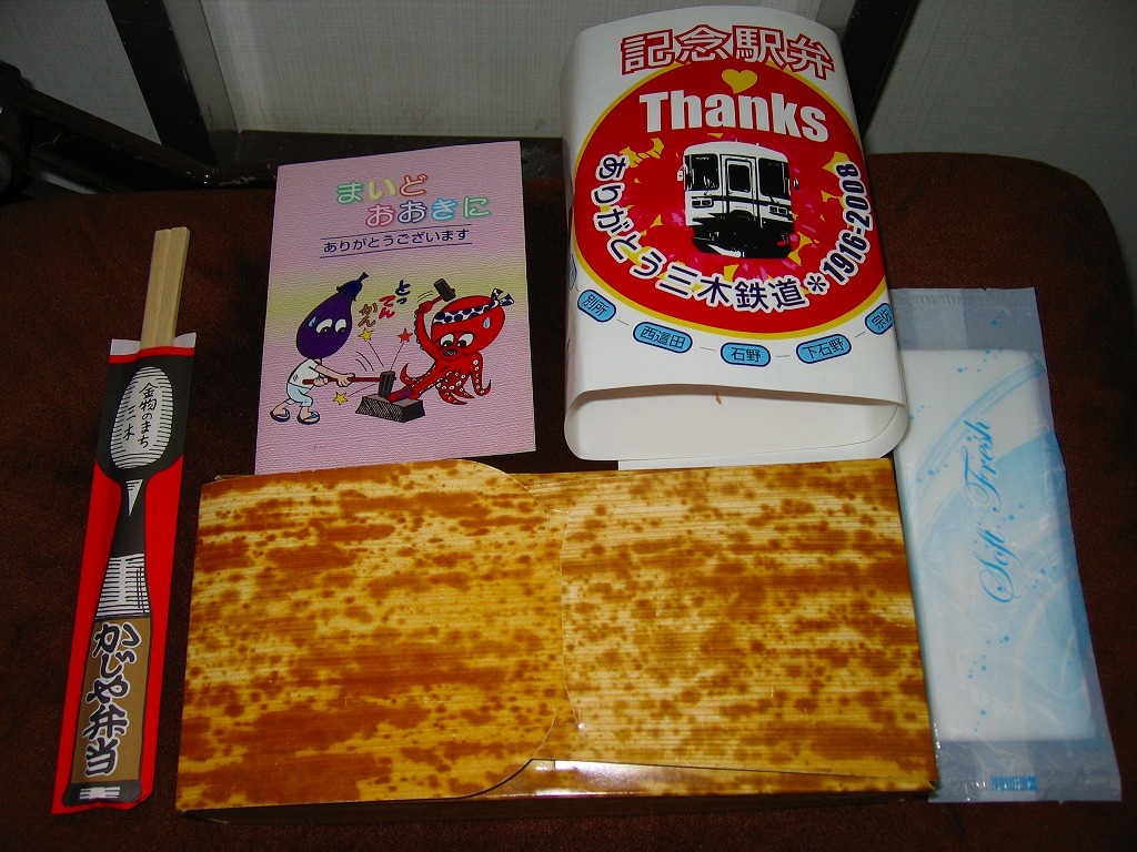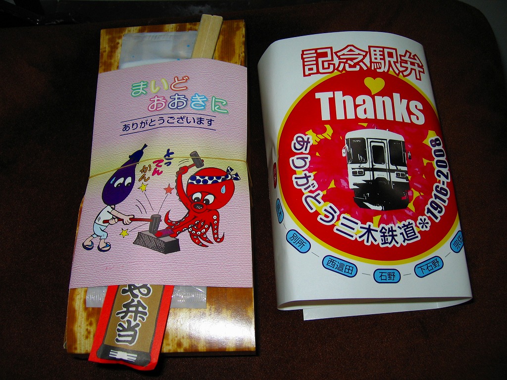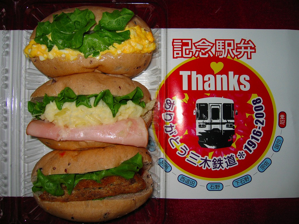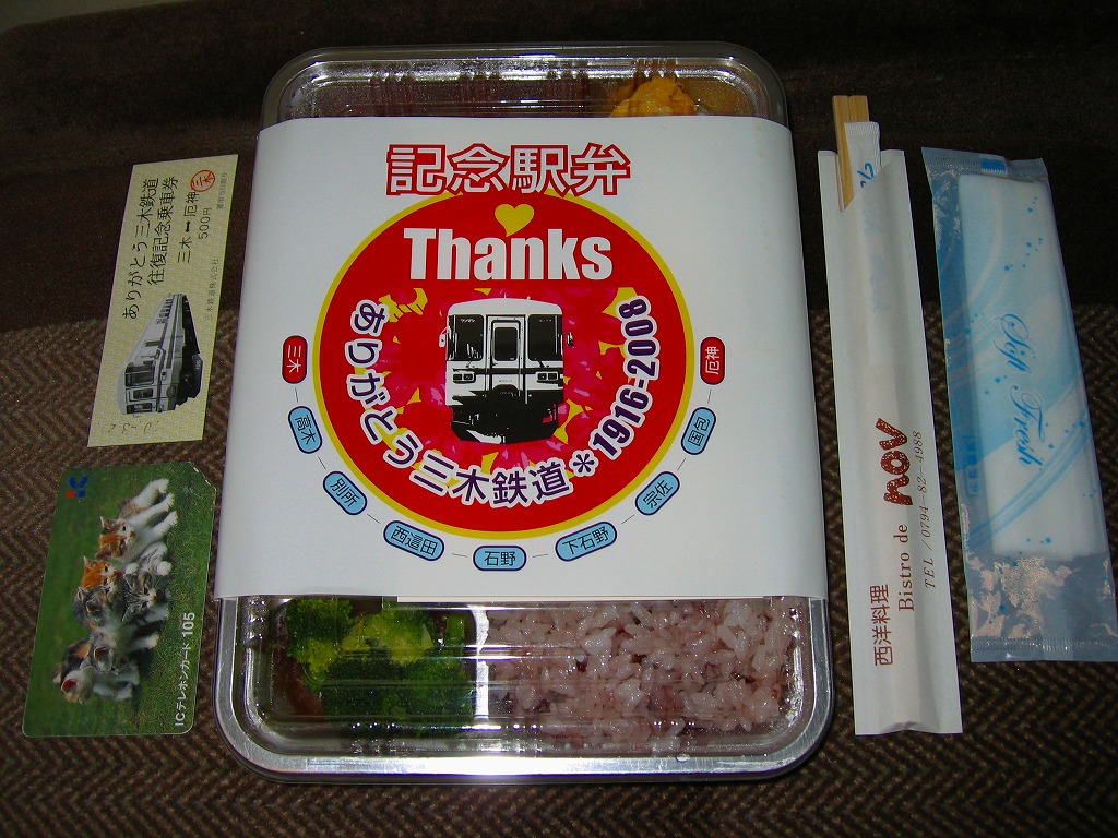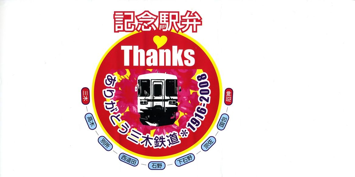 三木鉄道の全線廃止に伴う記念イベントの一環として、2008(平成20)年3月の土休日に駅前で販売された、三木駅史上最初で最後の駅弁。市内各店を調製元とする、価格と掛紙を揃えた弁当類が、訪問時で7種類販売されていた。