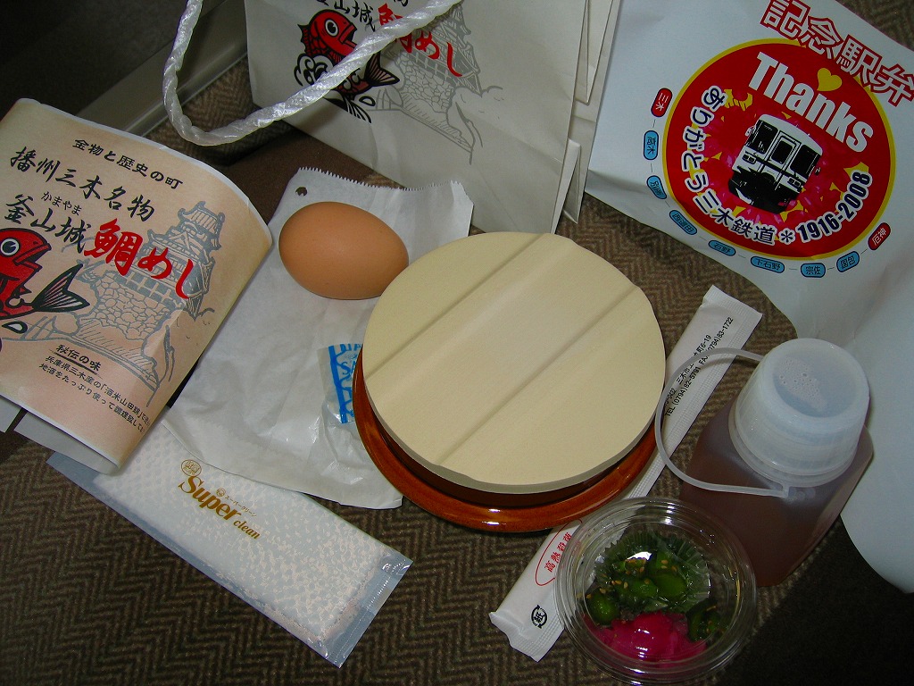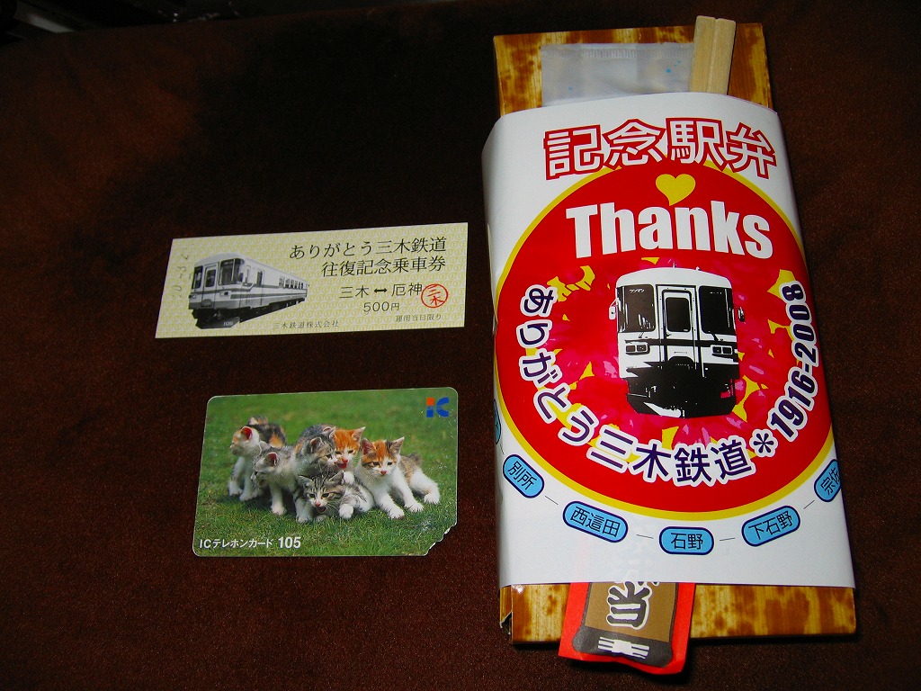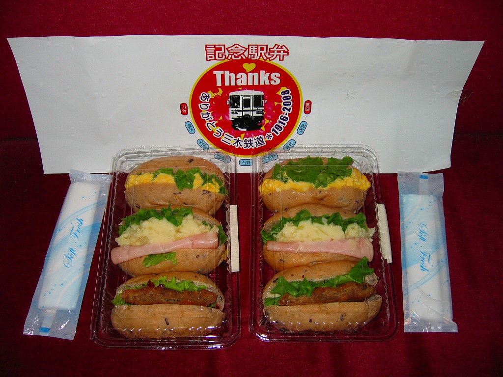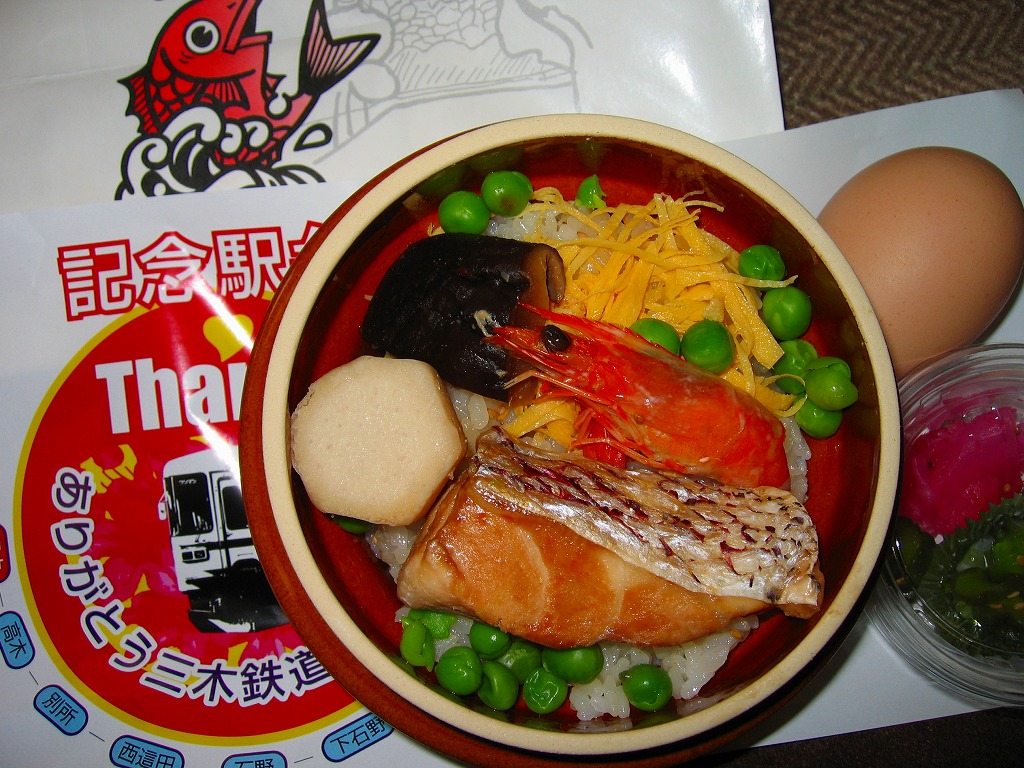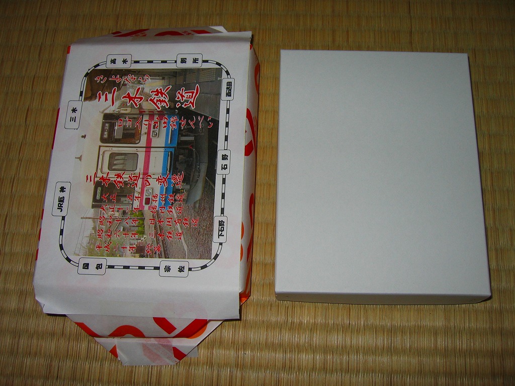 三木鉄道の全線廃止に伴う記念イベントの一環として、2008(平成20)年3月の土休日に駅前で販売された、三木駅史上最初で最後の駅弁。市内各店を調製元とする、価格と掛紙を揃えた弁当類が、訪問時で7種類販売されていた。