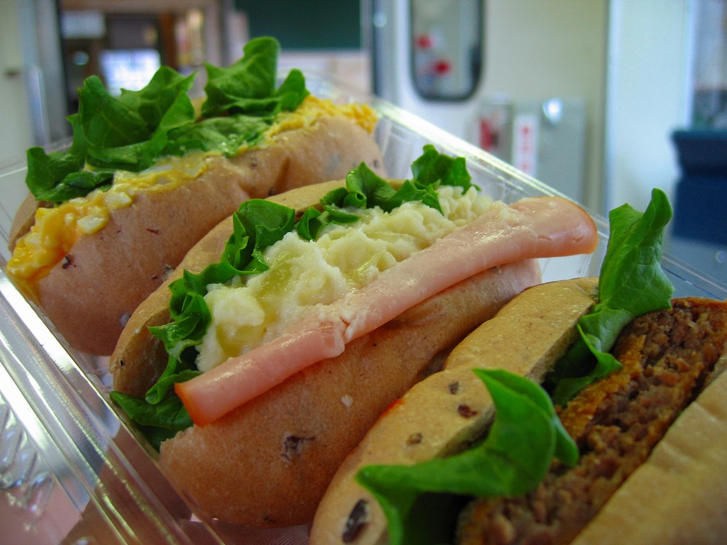 古代米を生地に混ぜて焼いた丸いパンを使った、メンチカツ、ポテトハム、玉子のサンドが各1個、透明な惣菜容器に収まる。これを2パックセットにして、おしぼりも2本添えて、共通掛紙に巻いての販売。見栄えにプロ、内容と味に手作りを感じる、朝食用か行楽用のおいしいサンドイッチ。調製元は商品に記されていないが、現地での掲示から調べると地元の西洋料理屋さん。