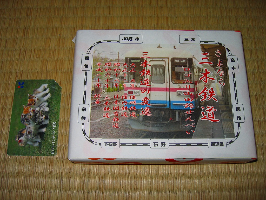 2007(平成19)年6月9日に三木駅で発売。小麦粉に黒豆や酒米「山田錦」を混ぜて焼き、三木鉄道の社章の焼き印を入れた、直径十数センチの薄いせんべいを5枚、透明なプラ製トレーに重ねて、透明なビニール袋に入れ、ボール紙の箱に詰め、三木市商店街連合会の包装紙で包み、駅撮りの車両写真や路線図を印刷した掛紙をセロテープで貼る。食べてもうまい記念品。