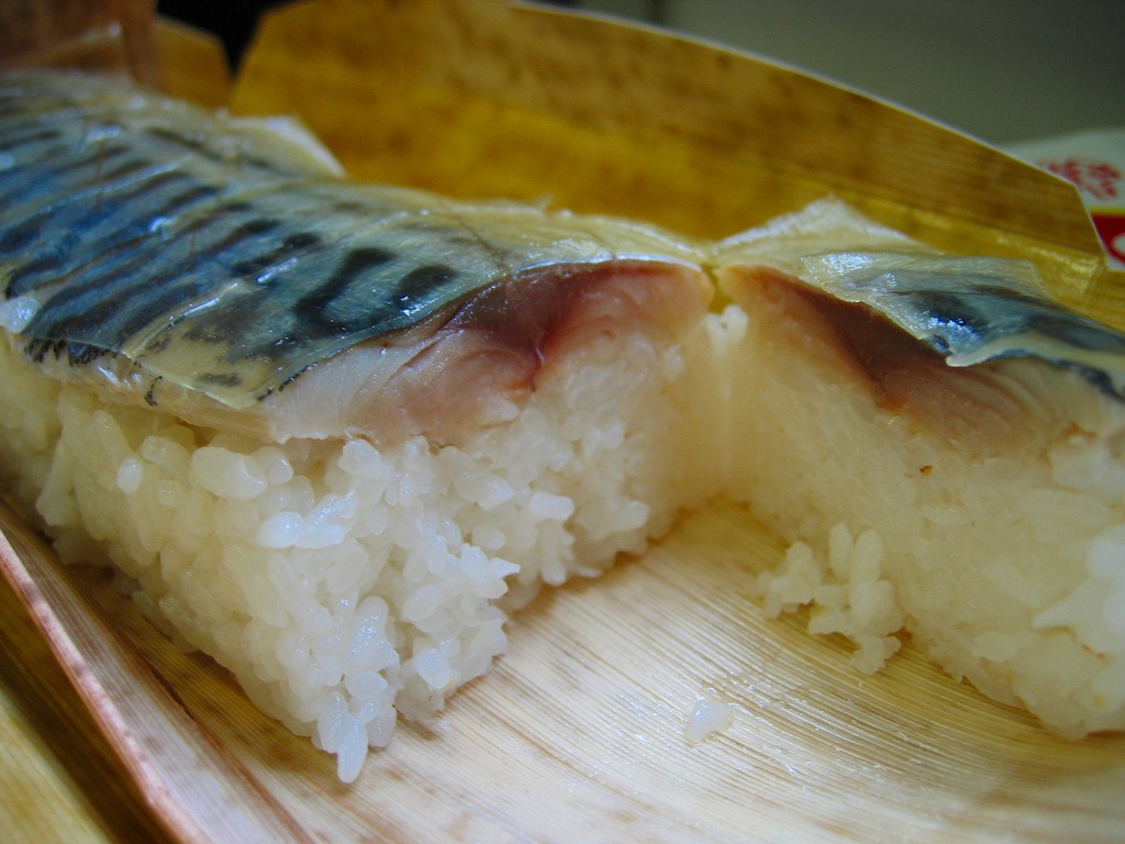 竹皮柄のボール紙製容器に割りばし、おしぼり、しおりを置いて輪ゴムで留め、共通掛紙を巻いてセロハンテープで留める。竹皮に包まれた中身は、昆布をかけた鯖の棒寿司が1本。同じような駅弁は各地にあるが、これはサバの身が少々薄いものの、脂の乗りは抜群だった。調製元は三木駅の市街からは少々の距離がある寿司屋。