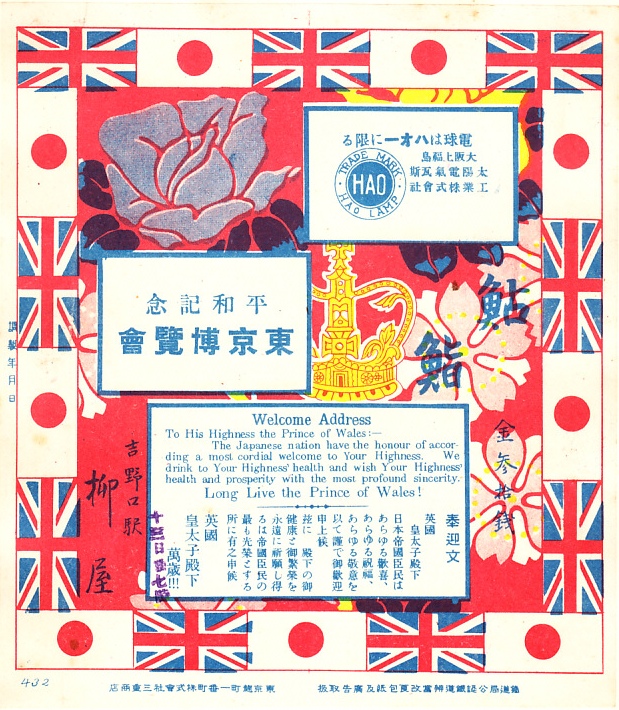 1922(大正11)年の調製と思われる、昔の吉野口駅弁の掛紙。同年に上野公園で開催された平和記念東京博覧会で英国の皇太子殿下が来日されたことを記念して、全国各地の駅弁屋が同じデザインの記念掛紙を使用したもの。周囲に日本と英国の国旗を配し、右に駅弁の名前、左下に調製元、下部に日英の歓迎文、上部の2枠は広告枠。