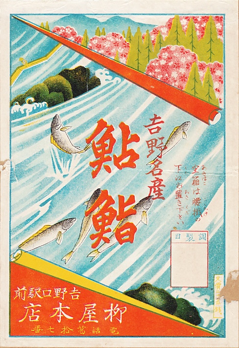 第二次大戦前の、大正時代か昭和時代のものと思われる、昔の吉野口駅弁の掛紙。中身はおそらく現在のものと同じ、アユの姿寿司だろう。桜と清流と魚影で吉野を表現か。