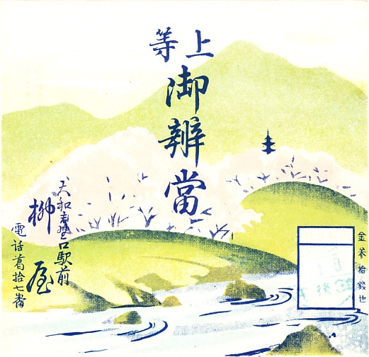 おそらく1930年代のものと思われる、昔の吉野口駅弁の掛紙。駅名に旧国名を加えて「大和吉野口駅前」と書いたのは、当時にそのほうが分かりやすかったのかどうか。