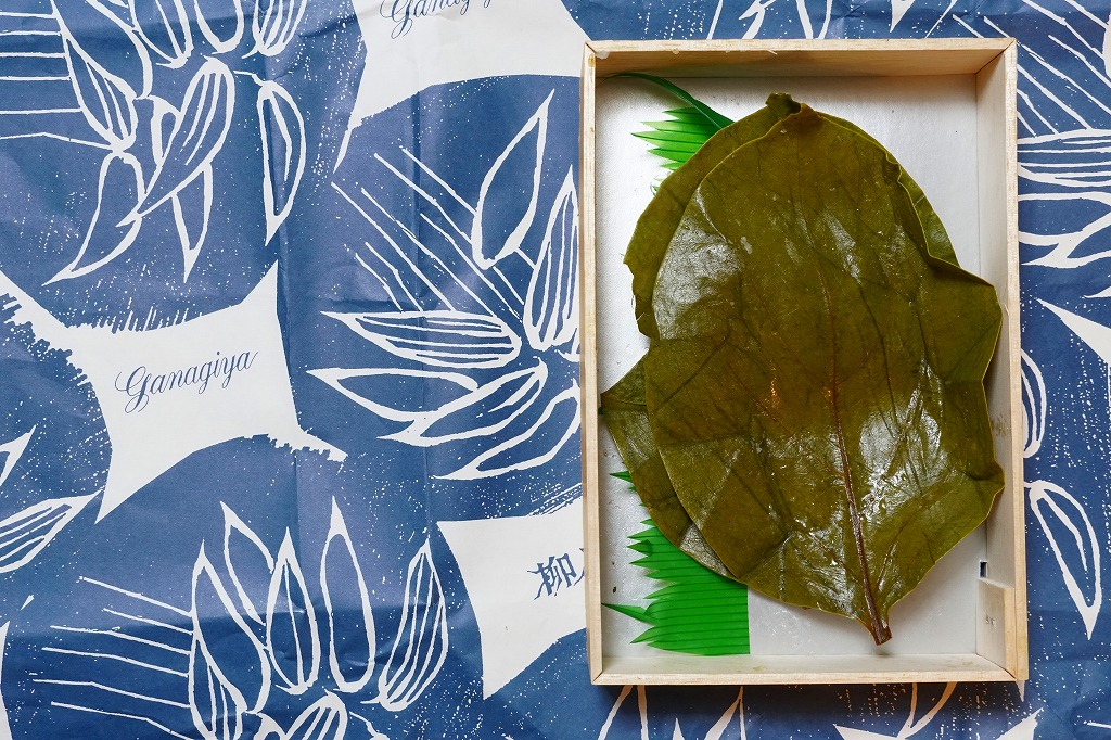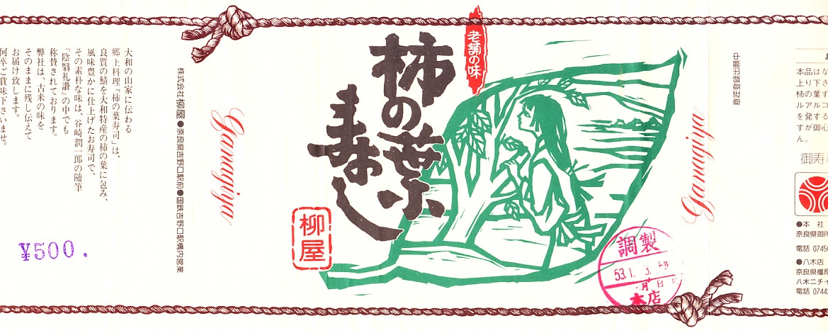 1978(昭和53)年1月3日の調製と思われる、昔の吉野口駅弁の掛紙。この柿の葉の形と樹木と女性の版画絵でできた絵柄は、2019年頃の終売まで変わらなかった。