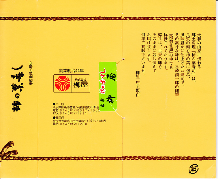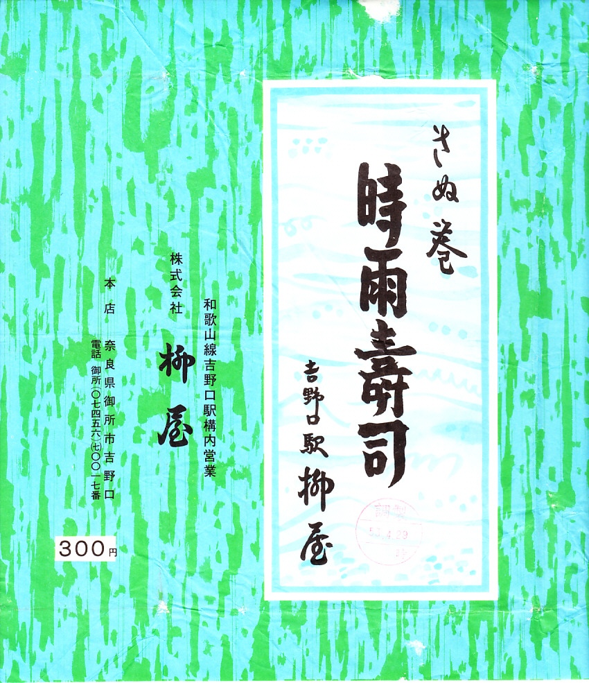 1978(昭和53)年4月29日の調製と思われる、昔の吉野口駅弁の掛紙。この絵柄と記載事項そして中身は2020年頃の終売まで変わらなかったが、駅弁の名前や調製元の標記は揺れ動いた。