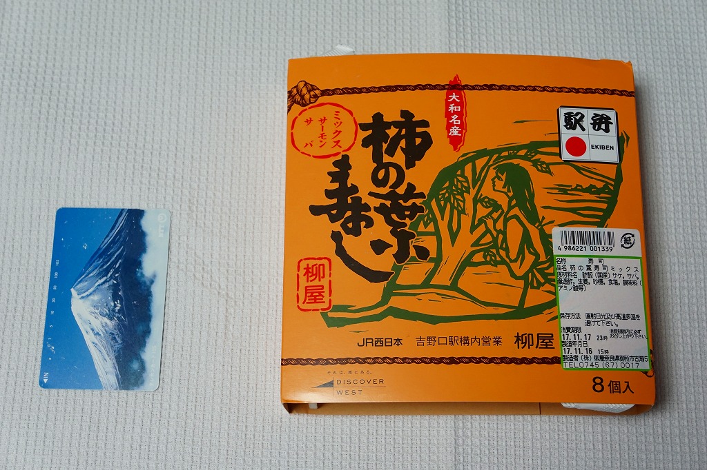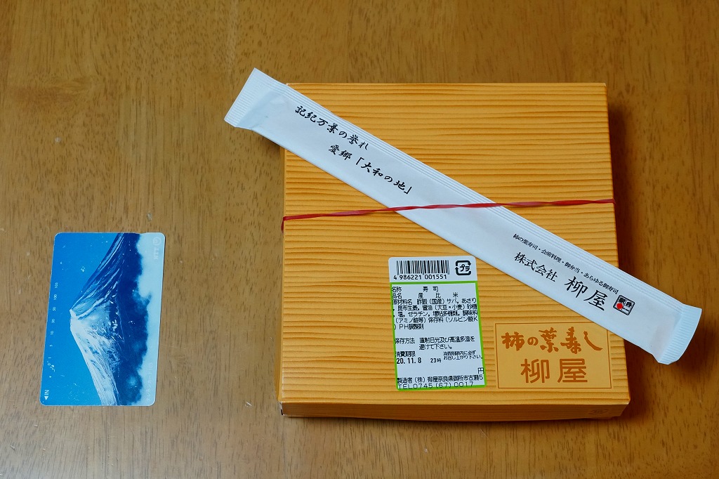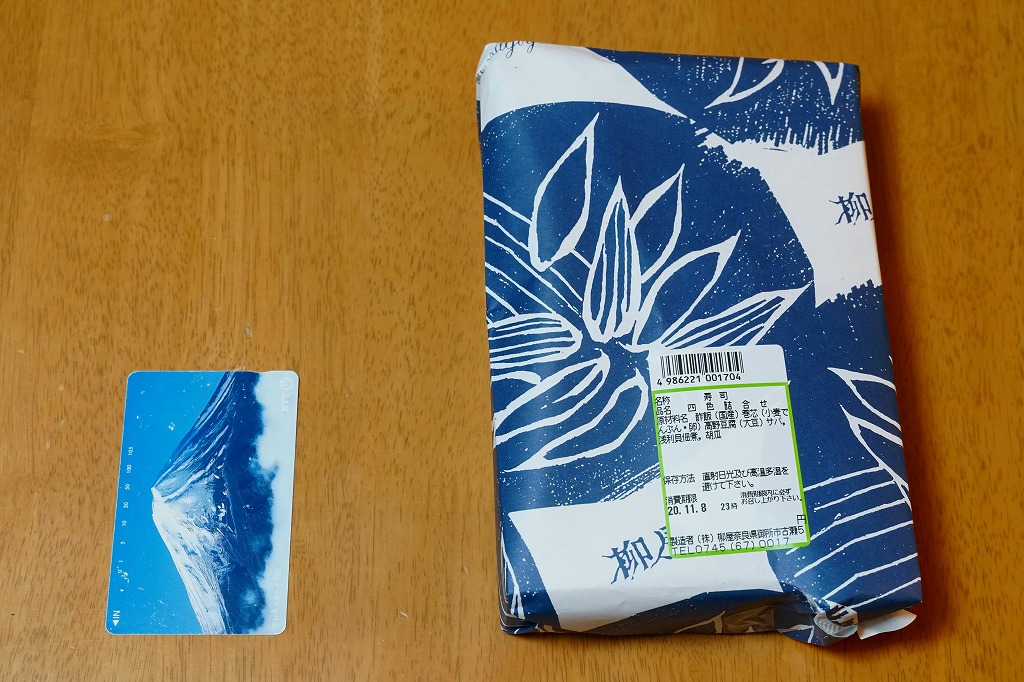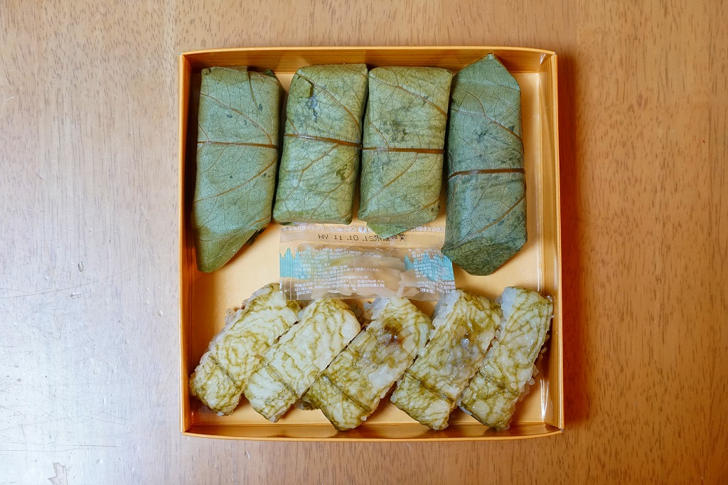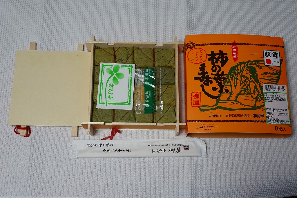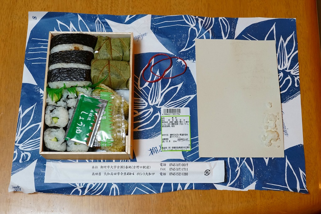 吉野口駅弁の調製元で買えた商品。太巻き3切れ、きゅうりの細巻き6本、サバの柿の葉寿し2個、きぬ巻時雨ずし3個で820円。駅で売られることはないだろうし、そもそも駅の駅弁売店が現存しない。こんな昔ながらの寿司屋の持ち帰り商品風な商品が近所にあれば、時々買いに来たいもの。