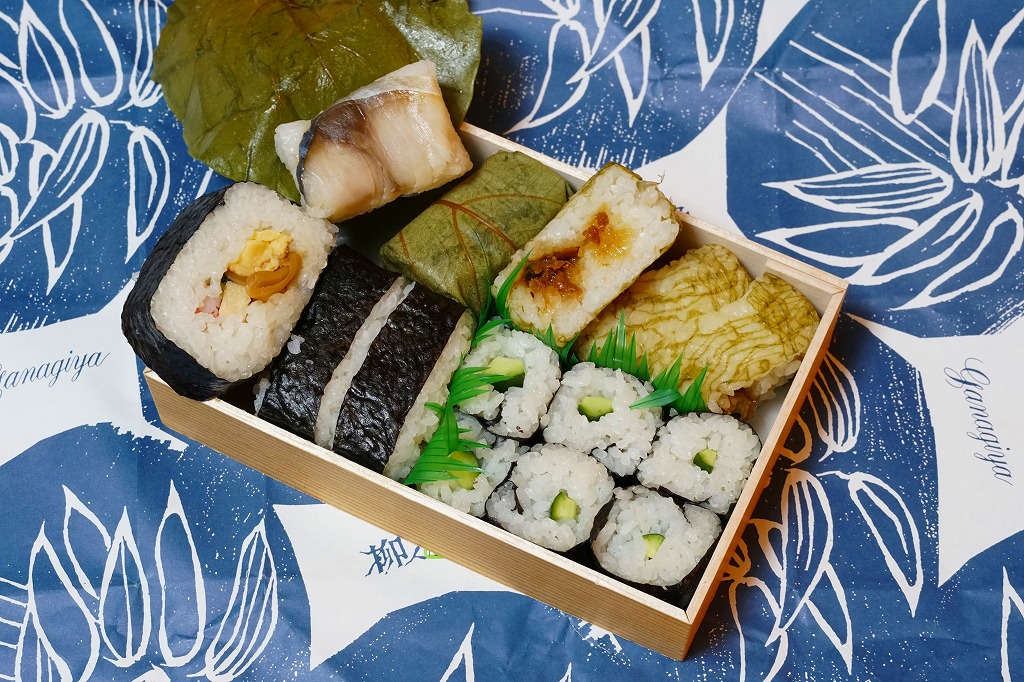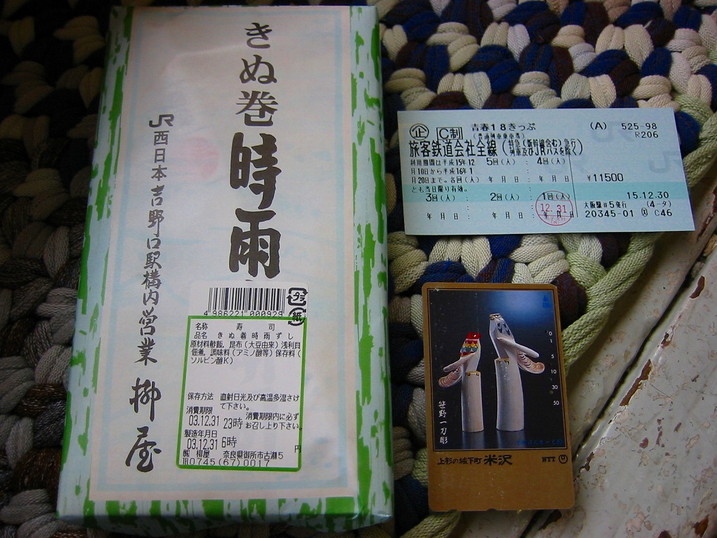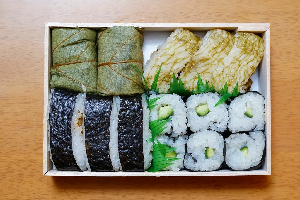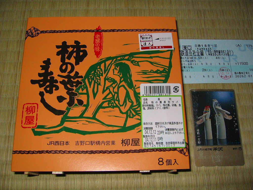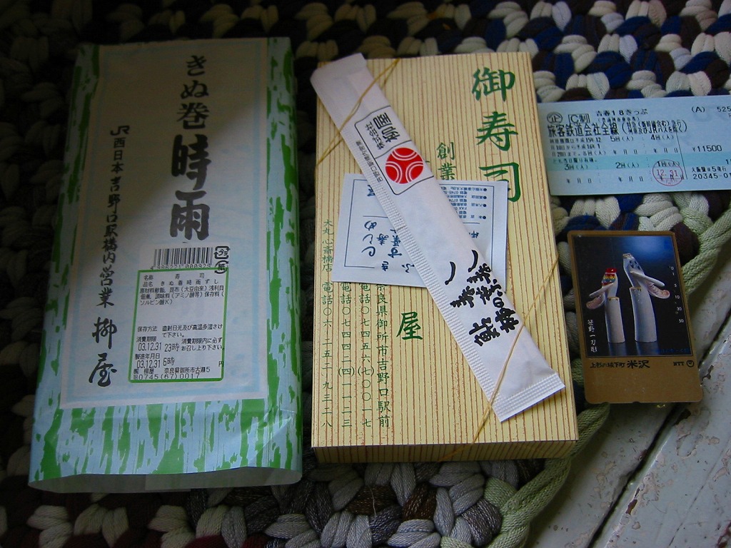 吉野口駅弁の調製元で買えた商品。太巻き3切れ、きゅうりの細巻き6本、サバの柿の葉寿し2個、きぬ巻時雨ずし3個で820円。駅で売られることはないだろうし、そもそも駅の駅弁売店が現存しない。こんな昔ながらの寿司屋の持ち帰り商品風な商品が近所にあれば、時々買いに来たいもの。