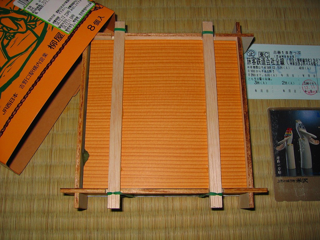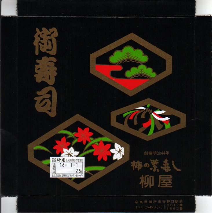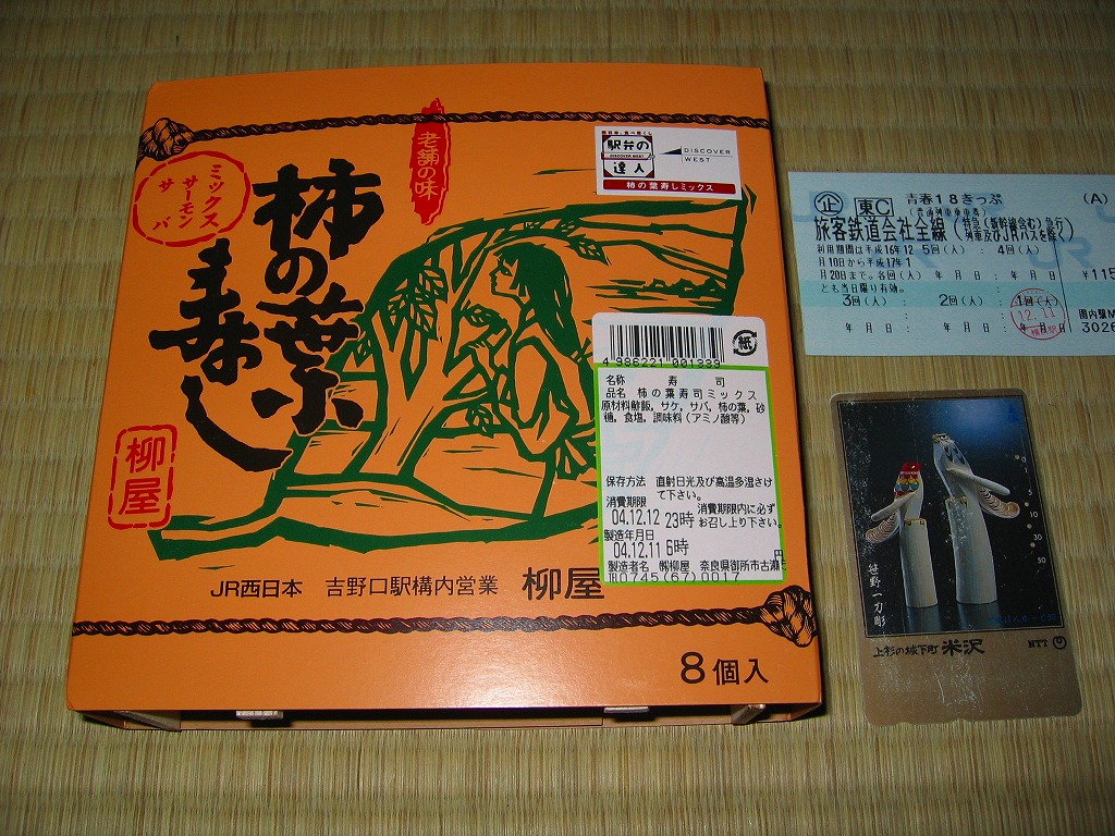 2004(平成16)年12月11日に購入した、吉野口駅弁のパッケージ。上記の2017年のものと色合いが異なるのは、おそらくスキャナのせい。絵柄は変わらない。21世紀になってもなお、パッケージに1988(昭和63)年制定の駅弁マークを入れていなかった。
