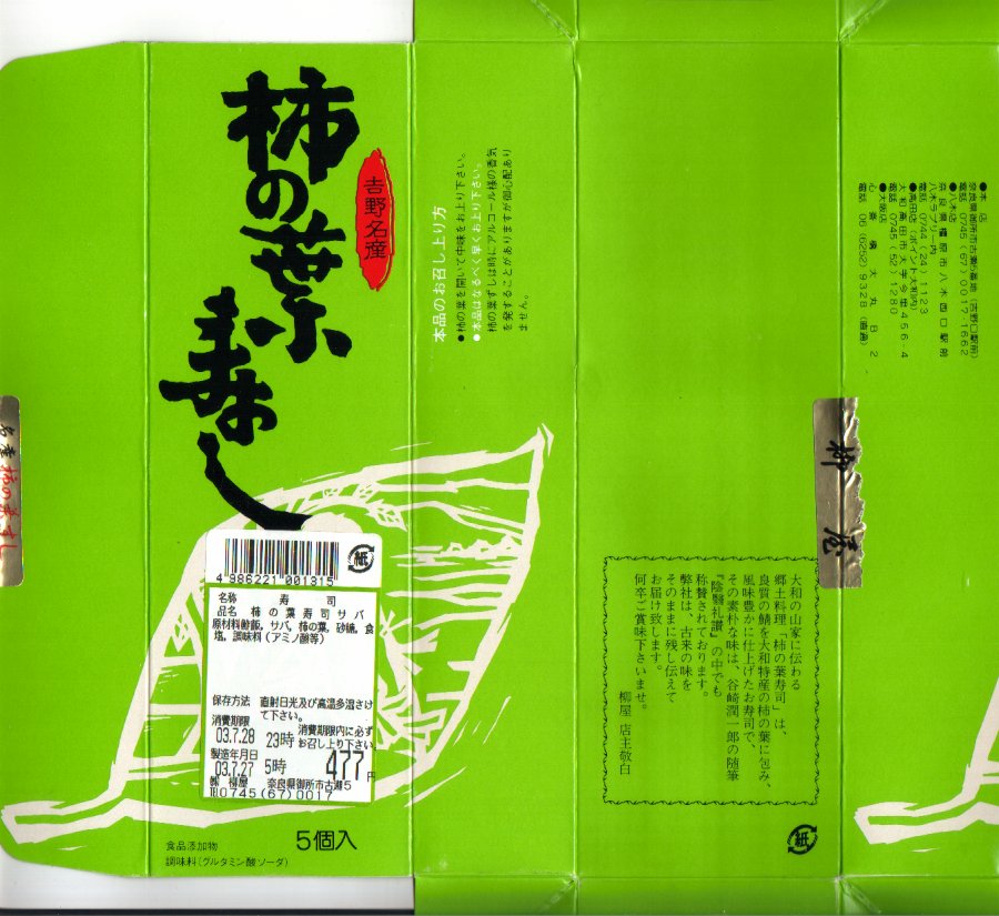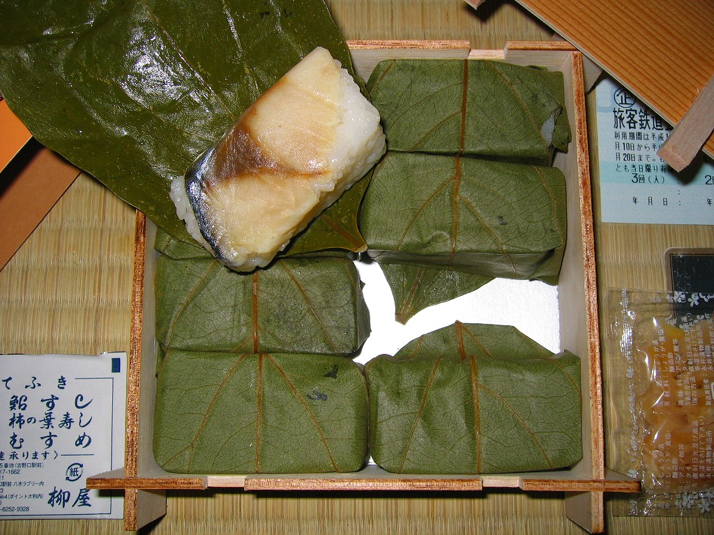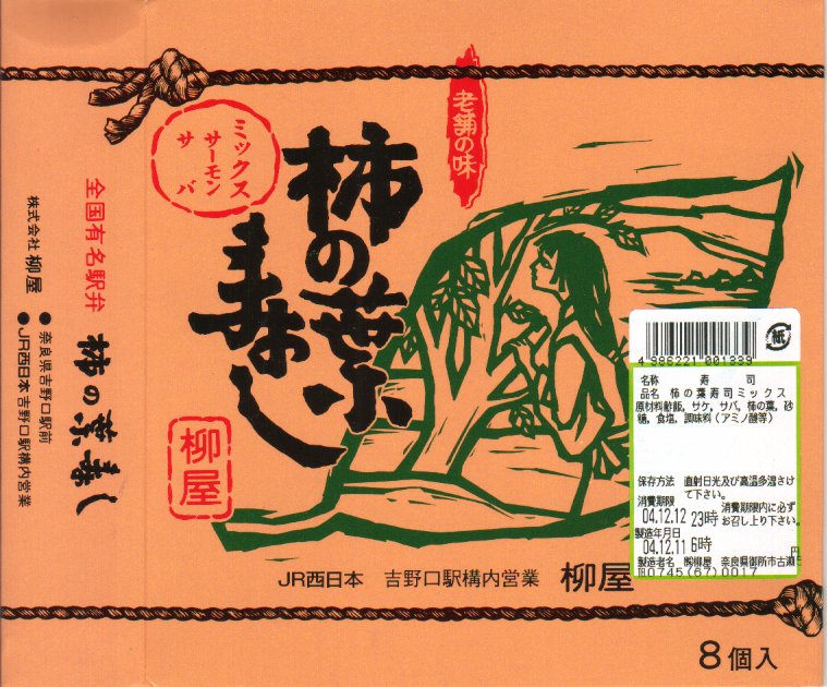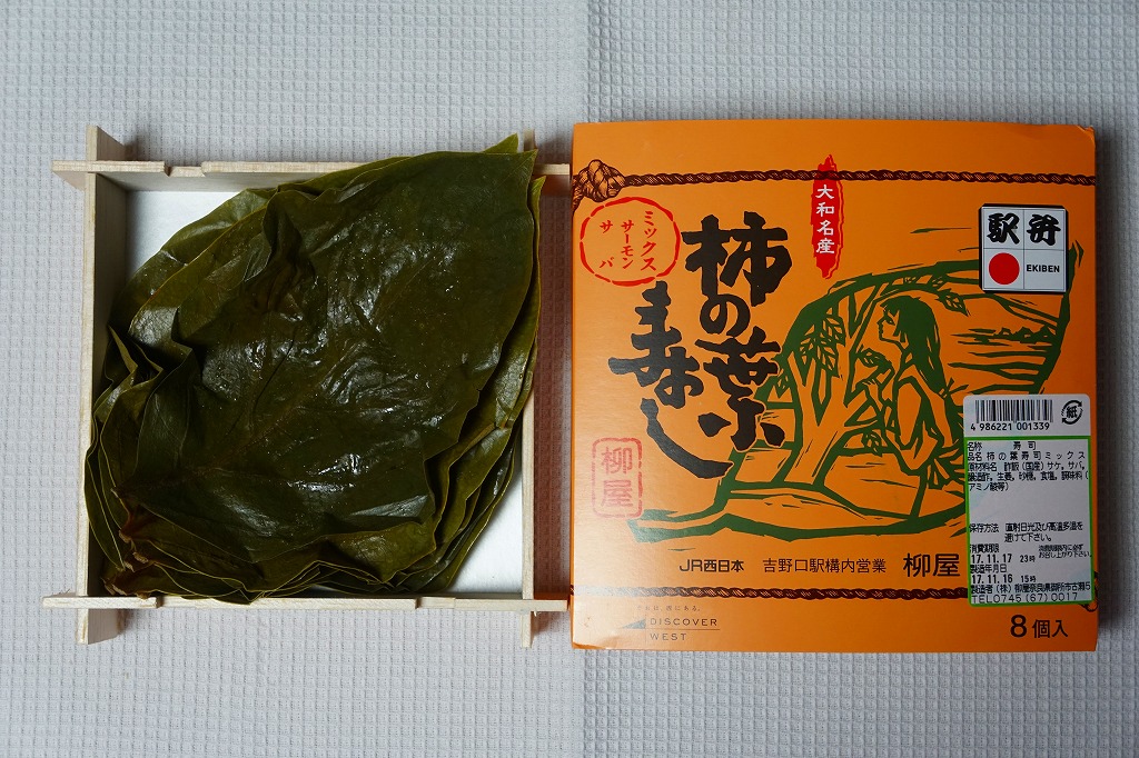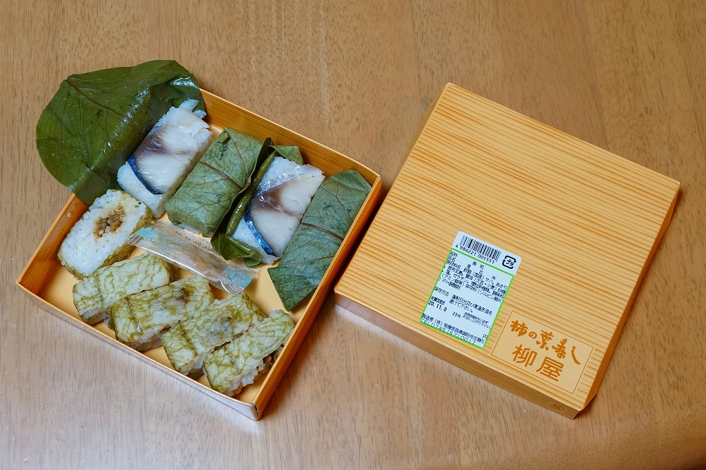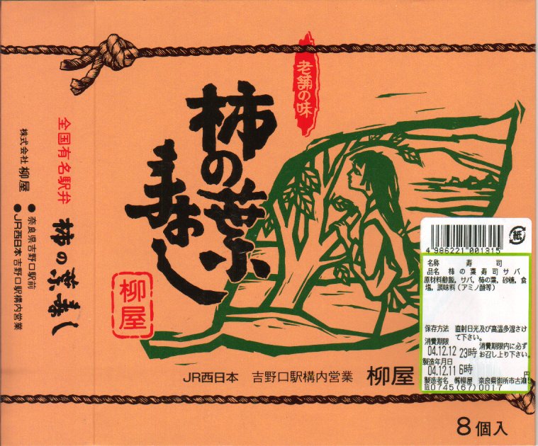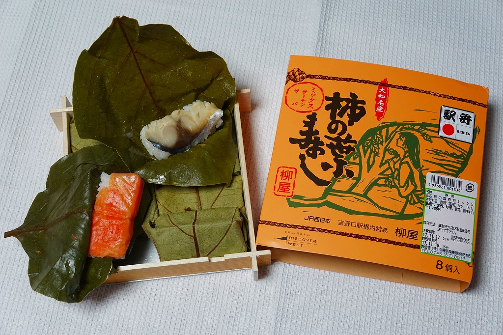 商品としても駅弁としても、奈良や和歌山を中心に各地で買える柿の葉寿司のうち、これが駅弁としての大将格であった。甘酢で締めた一口サイズの、鯖や鮭の押し寿司を柿の葉に包み、長方形の容器に8個詰める。地域や調製元の個性が出ない内容ではあるものの、柿の葉寿司は幕の内弁当と異なり、立てても裏返しても中身が崩れないので、持ち運びや車内販売で重宝した。2004年度のJR西日本の駅弁キャンペーン「駅弁の達人」の対象駅弁。
