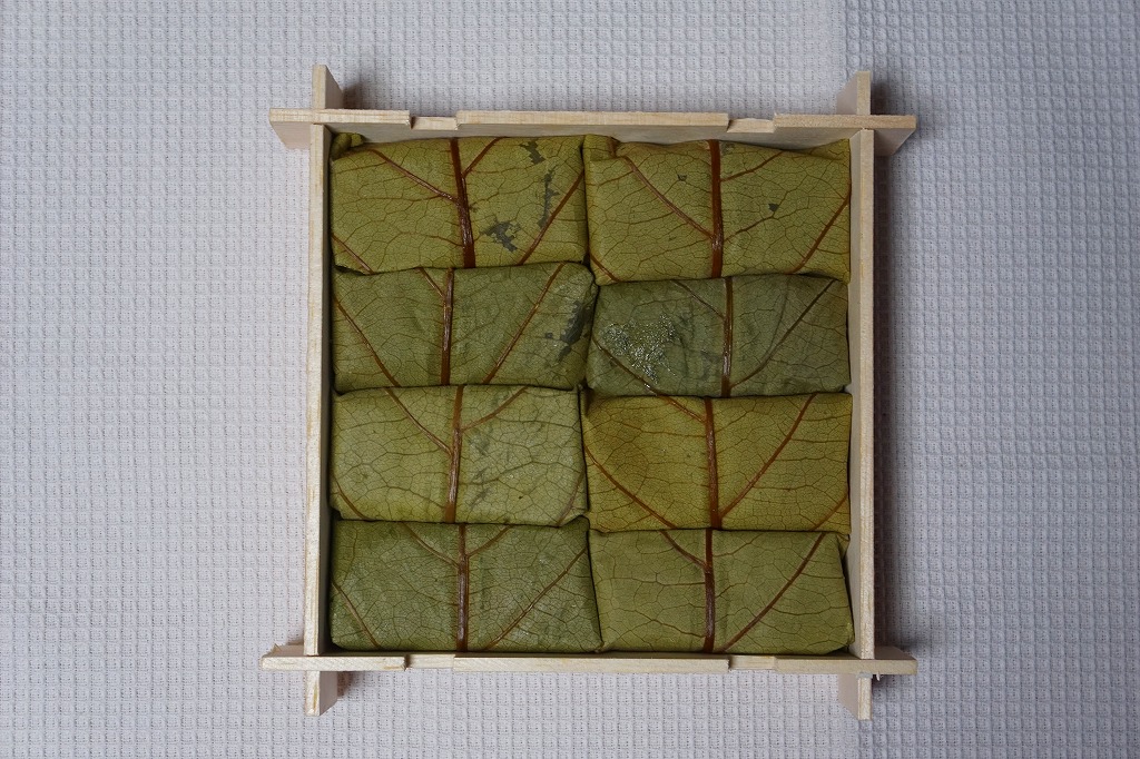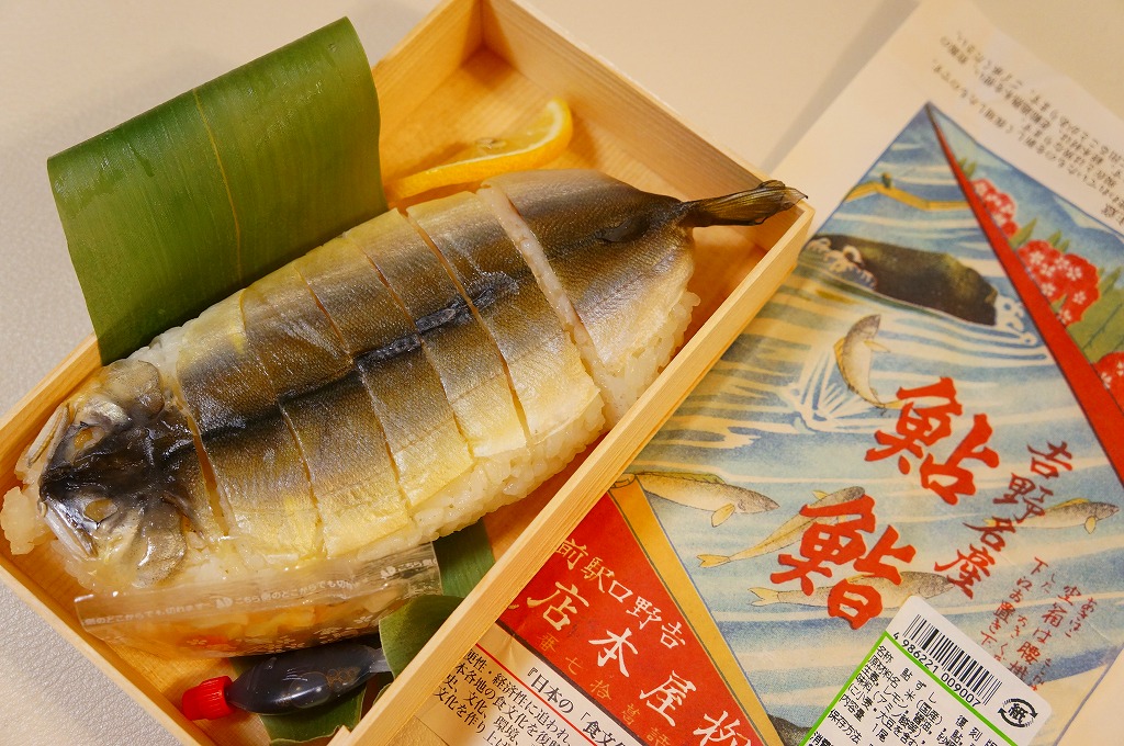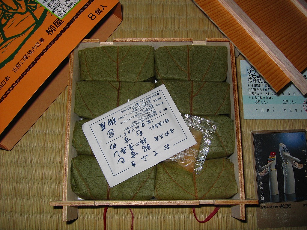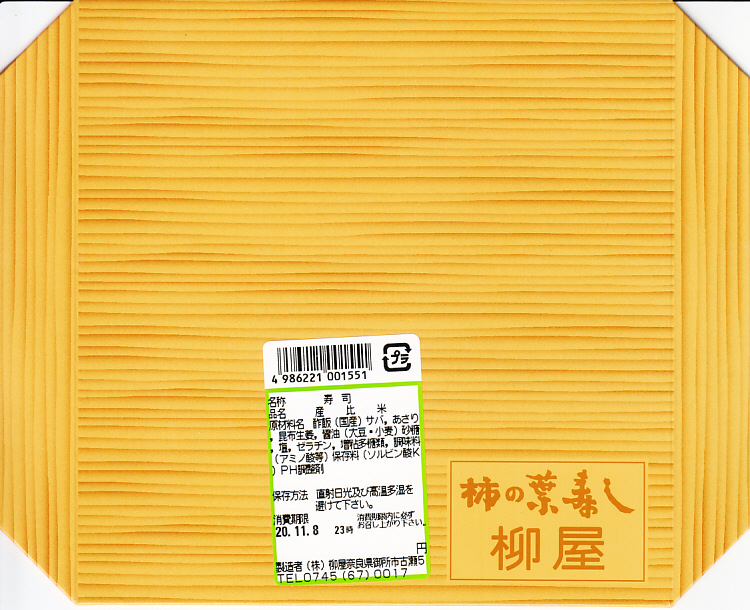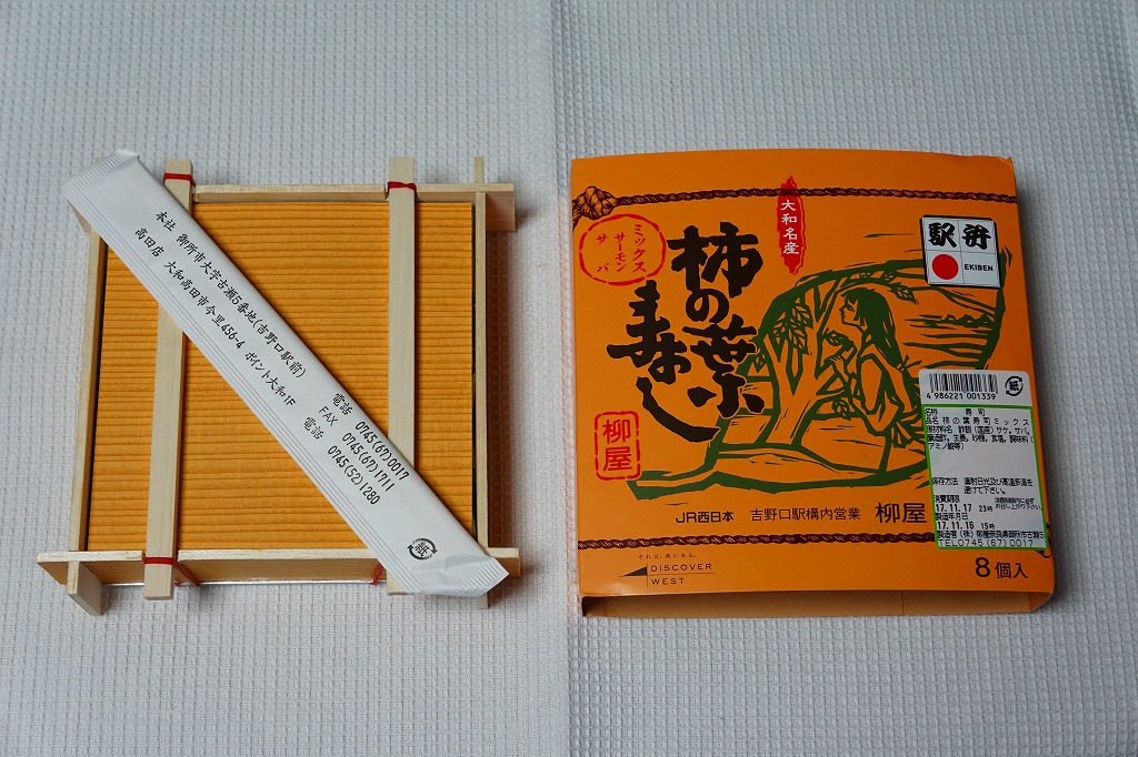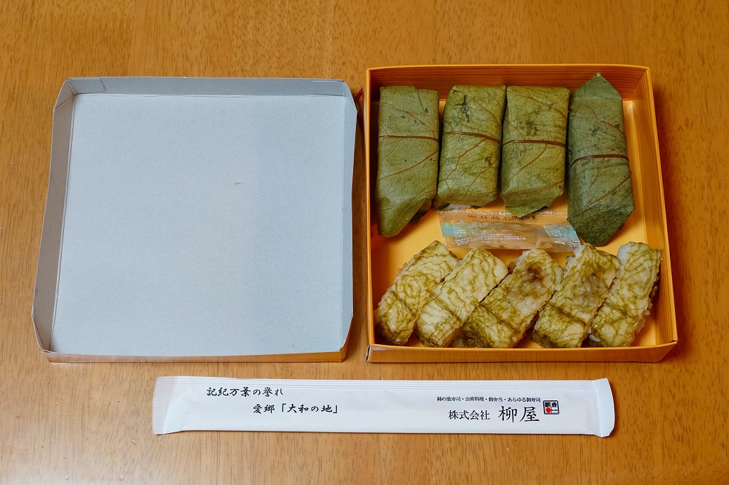 商品としても駅弁としても、奈良や和歌山を中心に各地で買える柿の葉寿司のうち、これが駅弁としての大将格であった。甘酢で締めた一口サイズの、鯖や鮭の押し寿司を柿の葉に包み、長方形の容器に8個詰める。地域や調製元の個性が出ない内容ではあるものの、柿の葉寿司は幕の内弁当と異なり、立てても裏返しても中身が崩れないので、持ち運びや車内販売で重宝した。2004年度のJR西日本の駅弁キャンペーン「駅弁の達人」の対象駅弁。