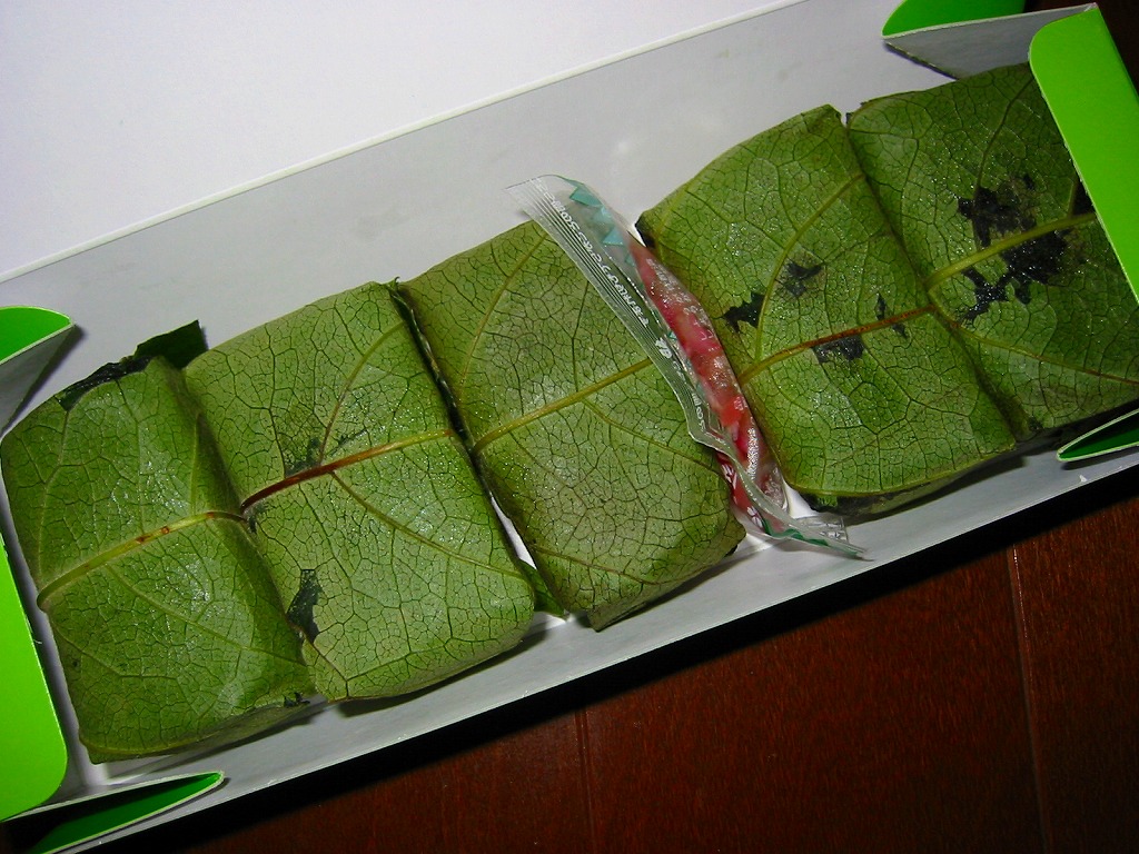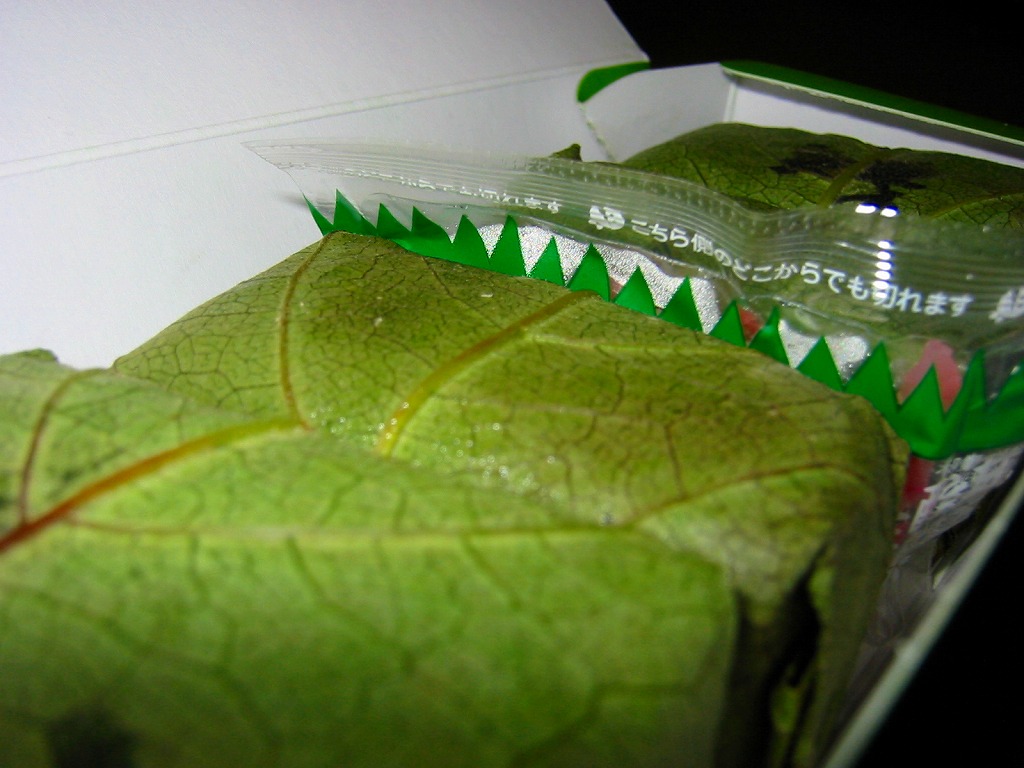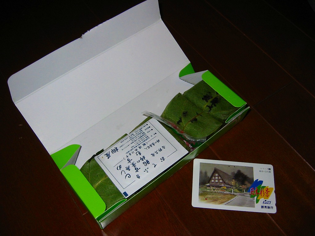 上記の駅弁「柿の葉寿し」のミニサイズ。笹の葉色のボール紙の容器に、サバの柿の葉寿司を5個詰めて500円、8個で880円のものより、単価が10円安い計算で、味は当然に同等。パッケージの記述によると、吉野口駅前の本店の他に八木と高田と大阪・心斎橋大丸に支店があり、そこでも買える模様。この商品は現存しない模様。