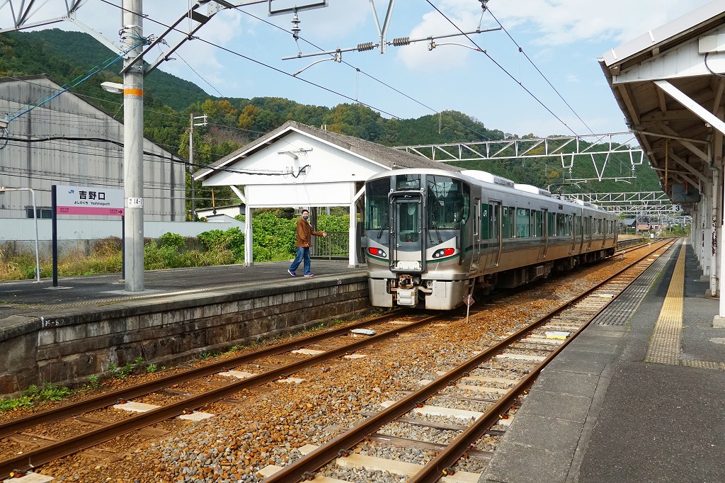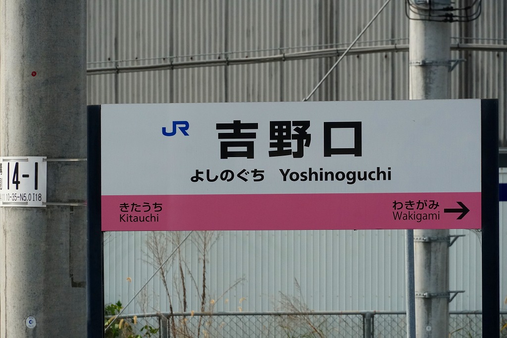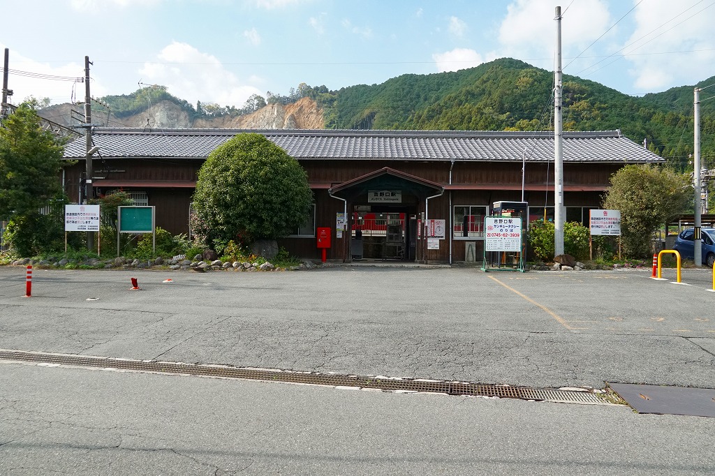 和歌山駅からJRの電車で約2時間、大阪阿部野橋駅から近鉄特急で約50分。駅名のとおり、鉄道が開通した明治時代は吉野の入口であり、後の延伸で現在は通過駅ないし乗換駅。駅弁は明治時代から長らく売られ、鮎ずしや柿の葉寿しが名物であったが、2018年の撤退で、今は駅では買えない。1896(明治29)年5月10日開業、奈良県御所市古瀬。