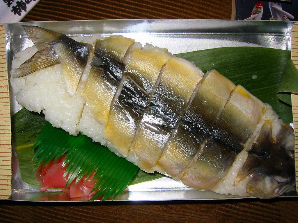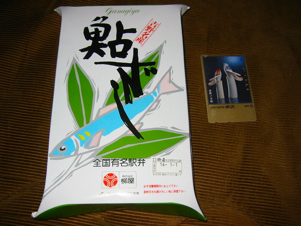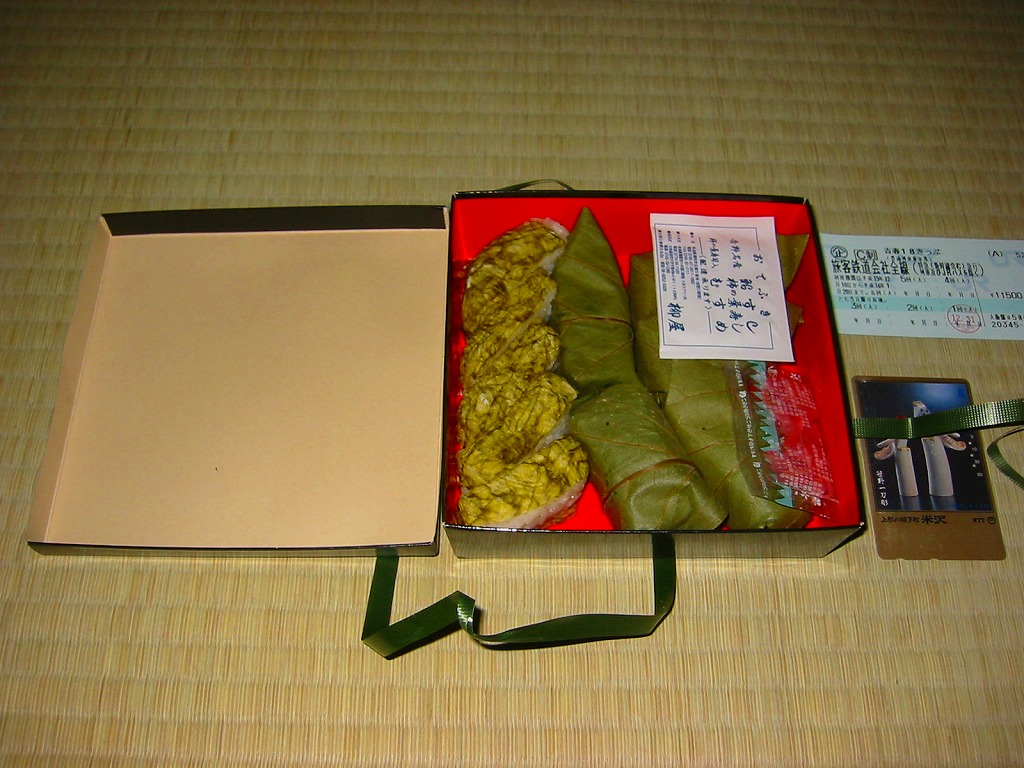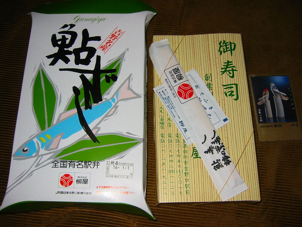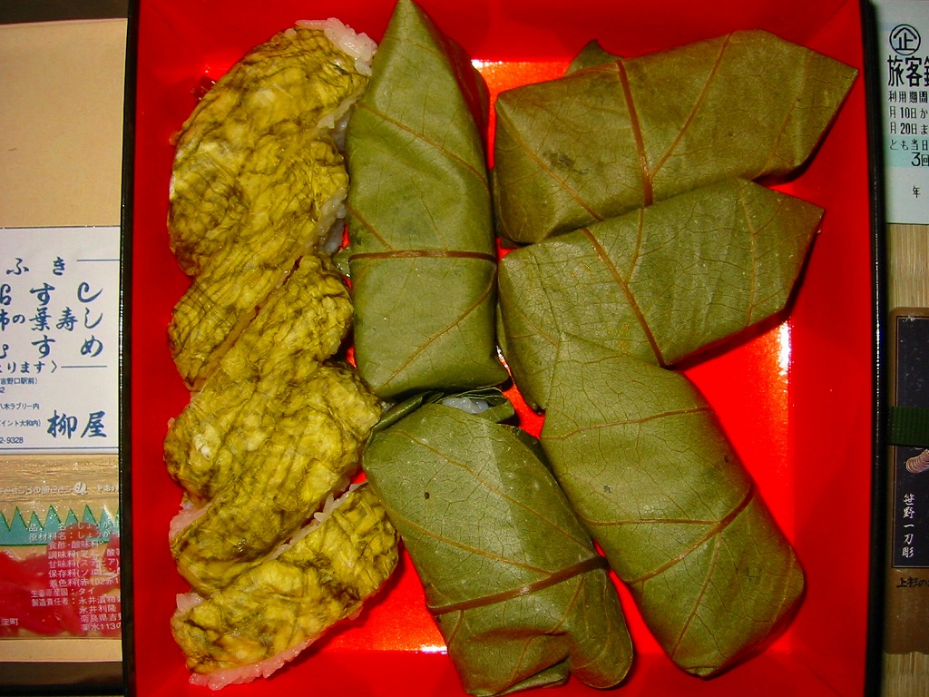 昔から吉野の名産だったそうで、駅弁としても1911(明治44)年からあるという、吉野口駅の鮎の姿寿司。鮎と笹の葉を描いたボール紙のパッケージに、木目調の汎用紙容器を入れ、その中で腹開きの鮎がまるごと一匹、笹を敷いた酢飯の上に載っている。価格は2003年の購入時で800円、2014年4月の消費税率改定で820円。