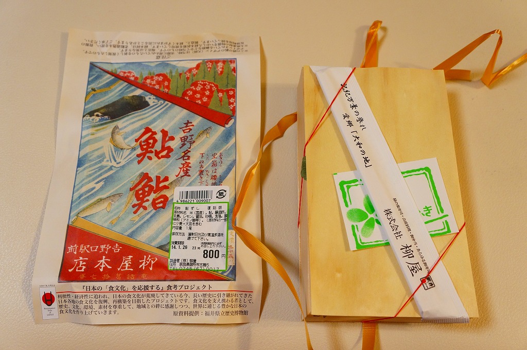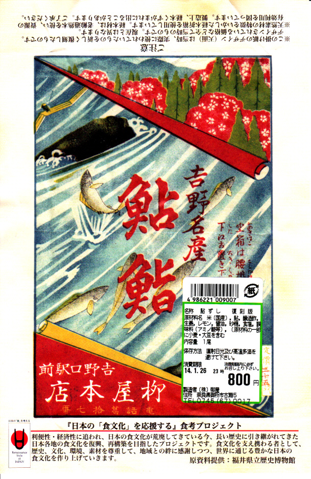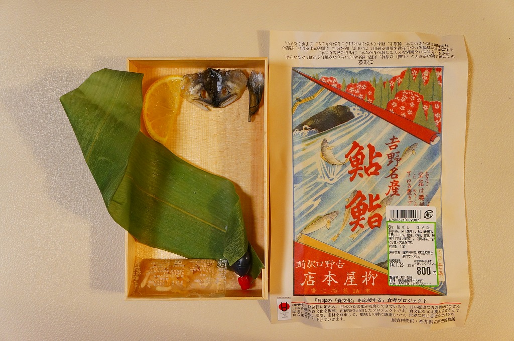 吉野口駅の駅弁「鮎ずし」について、福井県の催事屋がプロデュースした、京王百貨店駅弁大会と阪神百貨店の駅弁大会で売られる復刻版。商品名は「掛紙復刻鮎鮨」とも。戦前昭和の頃のものと思われる駅弁掛紙の絵柄を使用、経木折の中身は、アユの姿寿司。掛紙や容器を気に留めなくても、こんな内容の鮎ずしそのものが、昭和あるいは明治時代の昔の味。現地で売られることはないだろう。