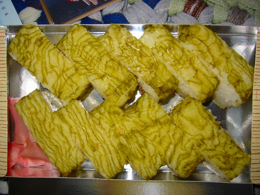 1962(昭和37)年の発売。酢飯にアサリのしぐれ煮をサンドイッチしたものを、おぼろ昆布で巻いたものを10切れ詰める。昭和時代の発売当時は三重県桑名のハマグリのしぐれ煮を挟んでいたそうな。価格は2003年の購入時で460円、2015年時点で480円。