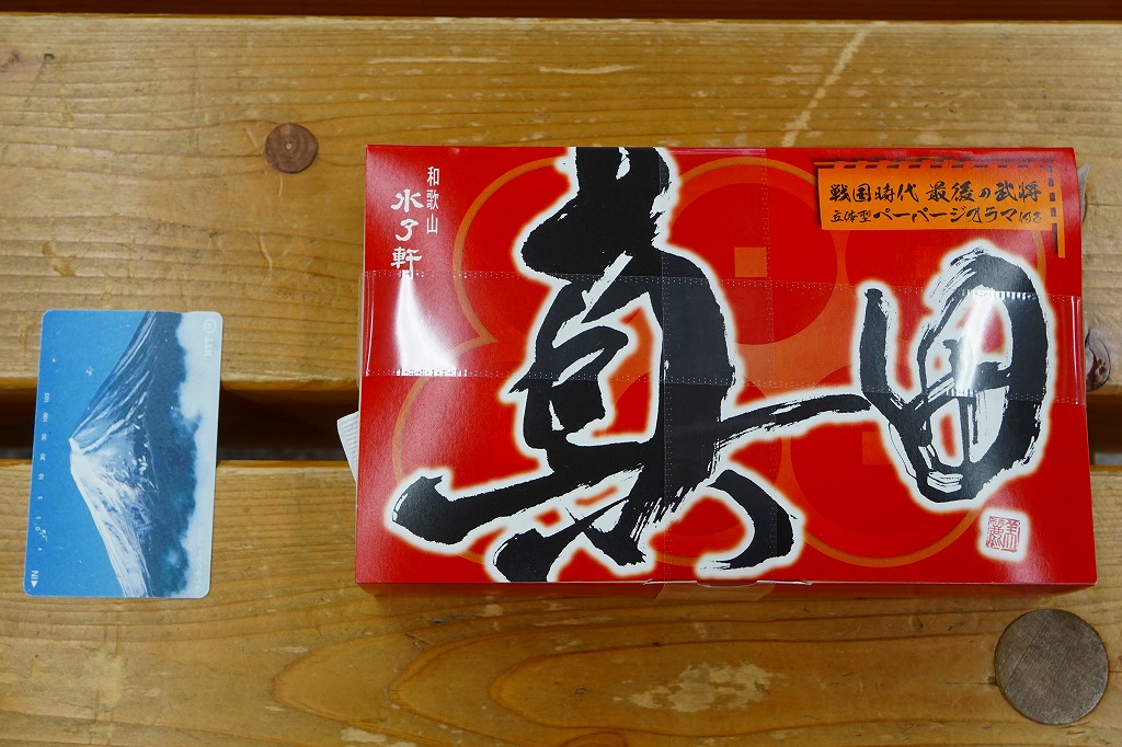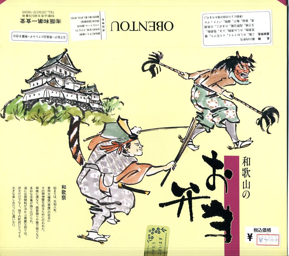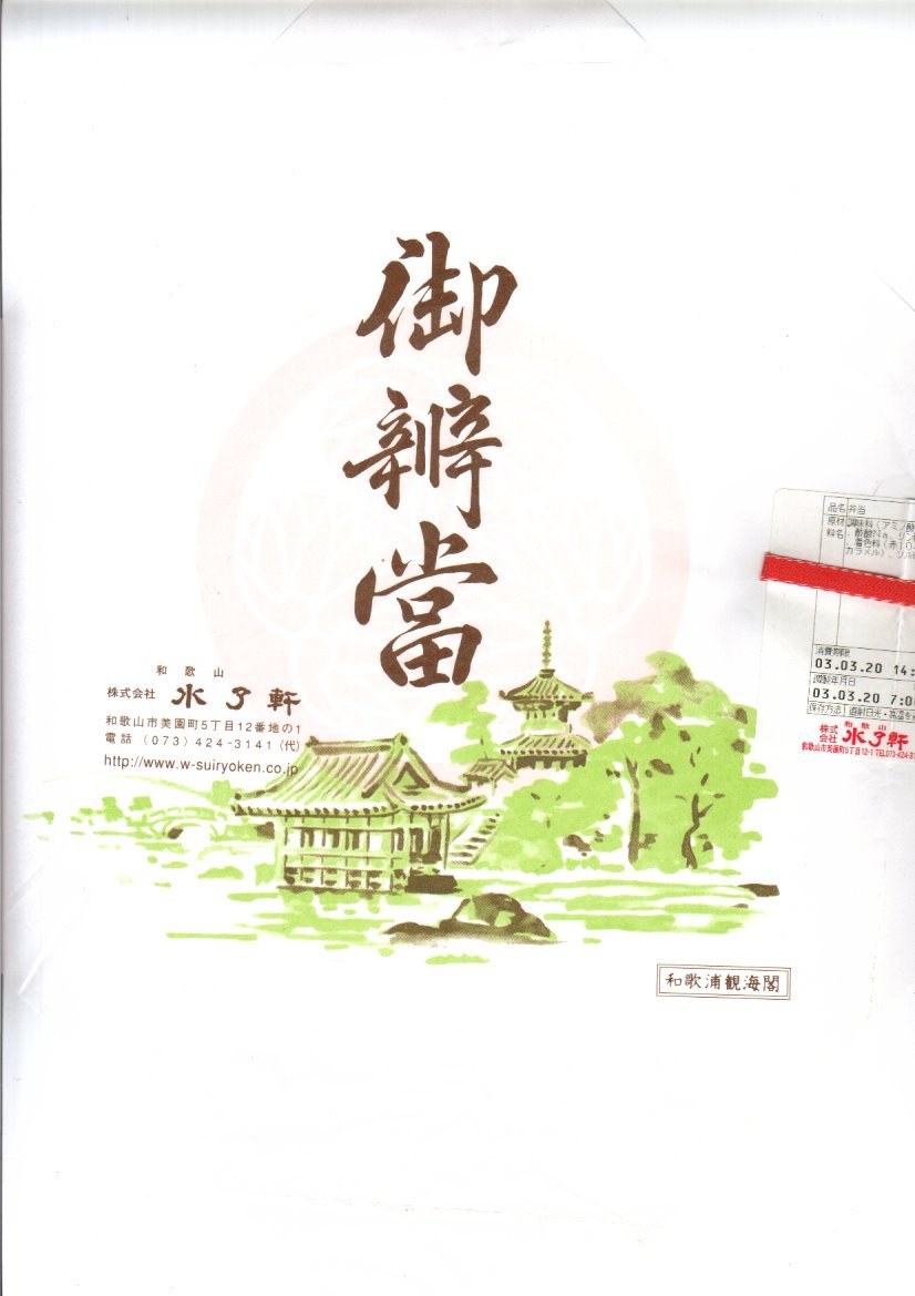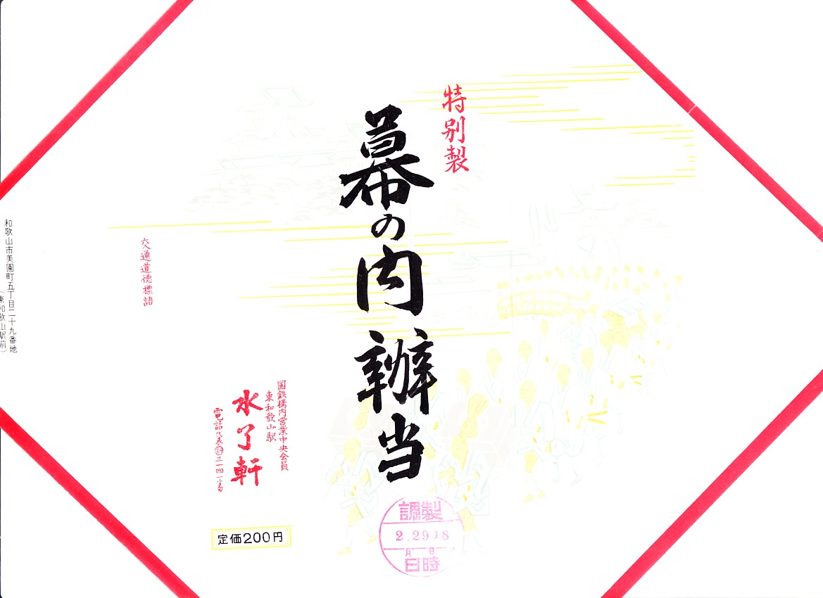 和歌山駅の実用的な幕の内弁当。安っぽいビニール容器を使用するが、掛紙は徳川の葵の家紋をバックに和歌浦・観海閣を描き旧字体で御弁当と記す古風なもの。中身は形の悪い胡麻振り俵飯に玉子焼や蒲鉾や鶏照焼に煮物揚げ物が少し入り、コンビニ弁当並みの値段で分量とまずまずの味が確保されている。秀逸な掛紙とのミスマッチも楽しめるか。現存しない模様。