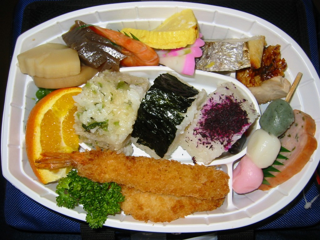 和歌山駅の阪和第一食堂版の並等幕の内駅弁。和歌山の城や祭を描いたボール紙の箱を使用、白いトレーに入った中身は、白御飯に鳥フライとエビフライ、椎茸や人参などの煮物、カマボコと玉子焼、牛肉にソーセージに酢の物など。見栄えも内容も風味も、寒々とした古き幕の内駅弁だが、白御飯の形状が俵2個に阪神競馬場型が1個となっており、なぜこんな形にしたのか聞いてみたい気がした。