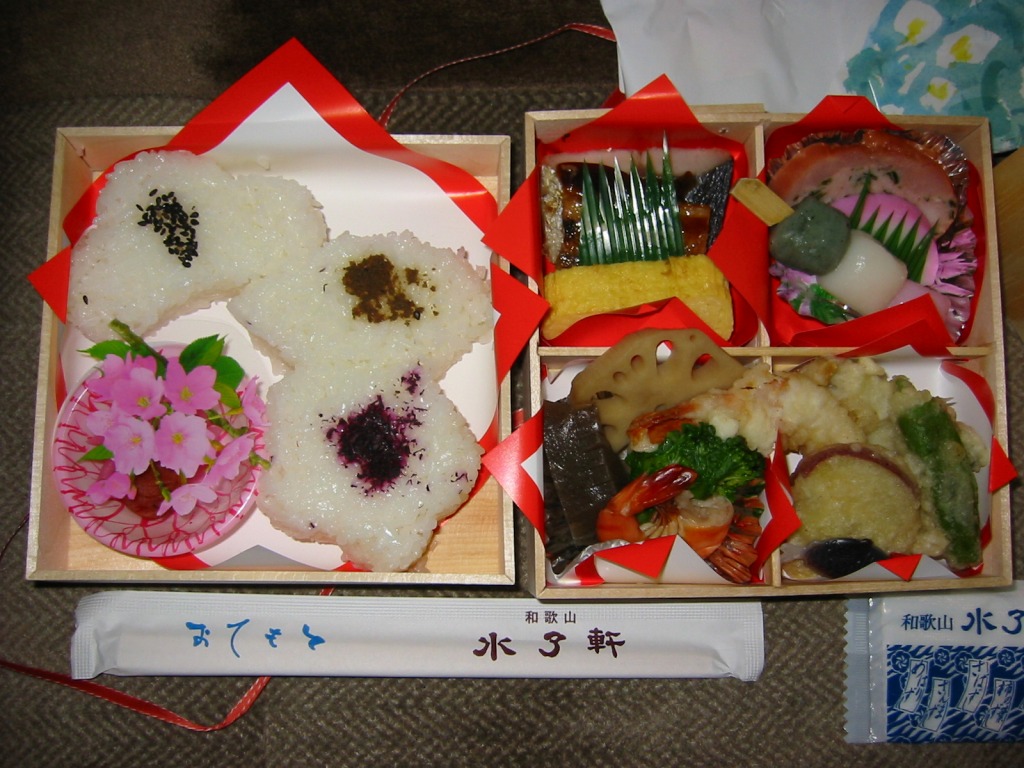 駅弁の名前や外観から判断して、春限定の駅弁か。花一杯の掛紙に包まれた正方形二重の経木折の中に、下段では桜型と扇形と松型の御飯に桜色のカップで梅干を添え、縦横に仕切られた上段には蓮根等の煮物、エビや薩摩芋等の揚げ物、玉子焼に焼き魚、ハムに蒲鉾に団子が入る。