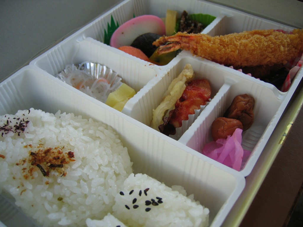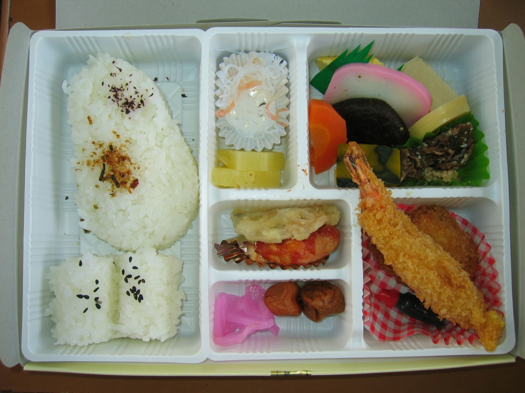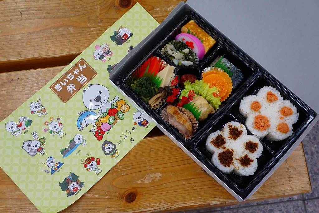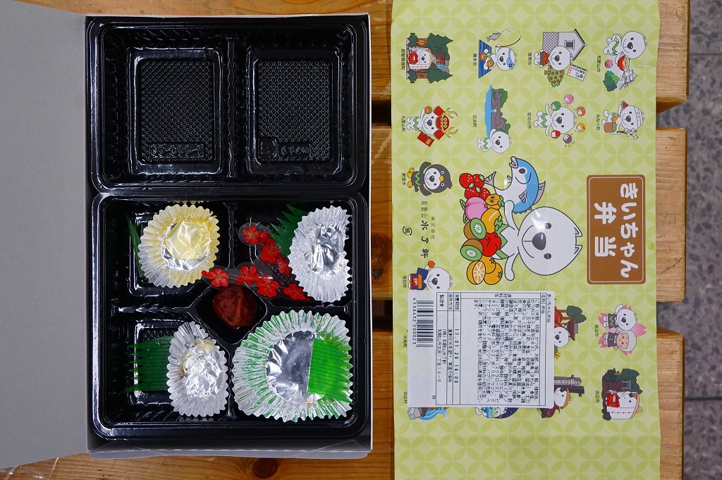 真っ白な惣菜弁当容器に入れた黒いトレーの中身は、犬の肉球を模したのかもしれないおかかとさけの花形御飯が各1個、玉子焼、かまぼこ、鶏肉、焼サバ、煮物、天ぷら、酢の物、梅干し、みかんなど。賑やかな仕出しタイプの弁当も、やや雑然とした感じか。なお、国体開催前の発売当初は、掛紙でなく専用紙箱を使い、その絵柄と中身はこれとは別物であった模様。2017年の初頭頃までの販売か。