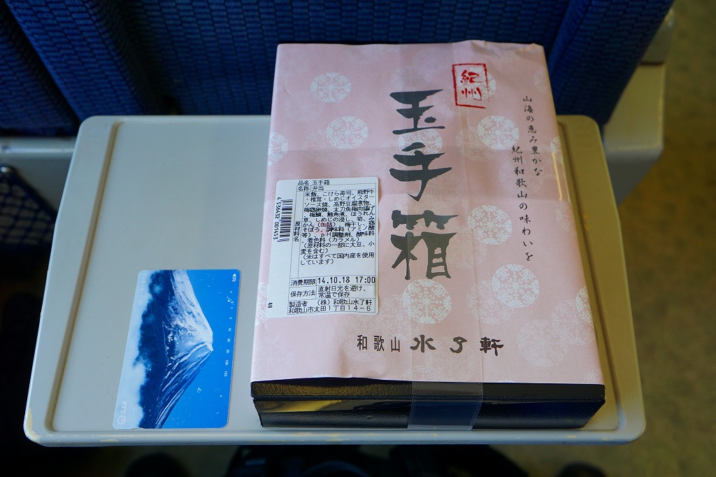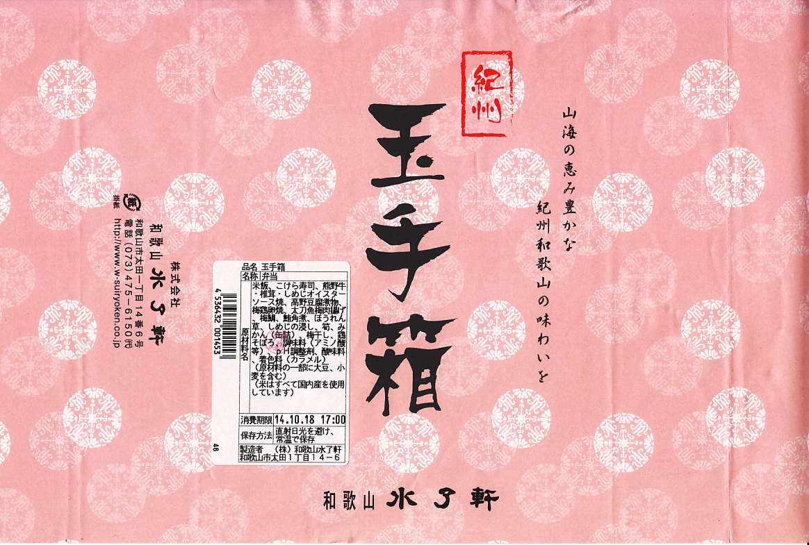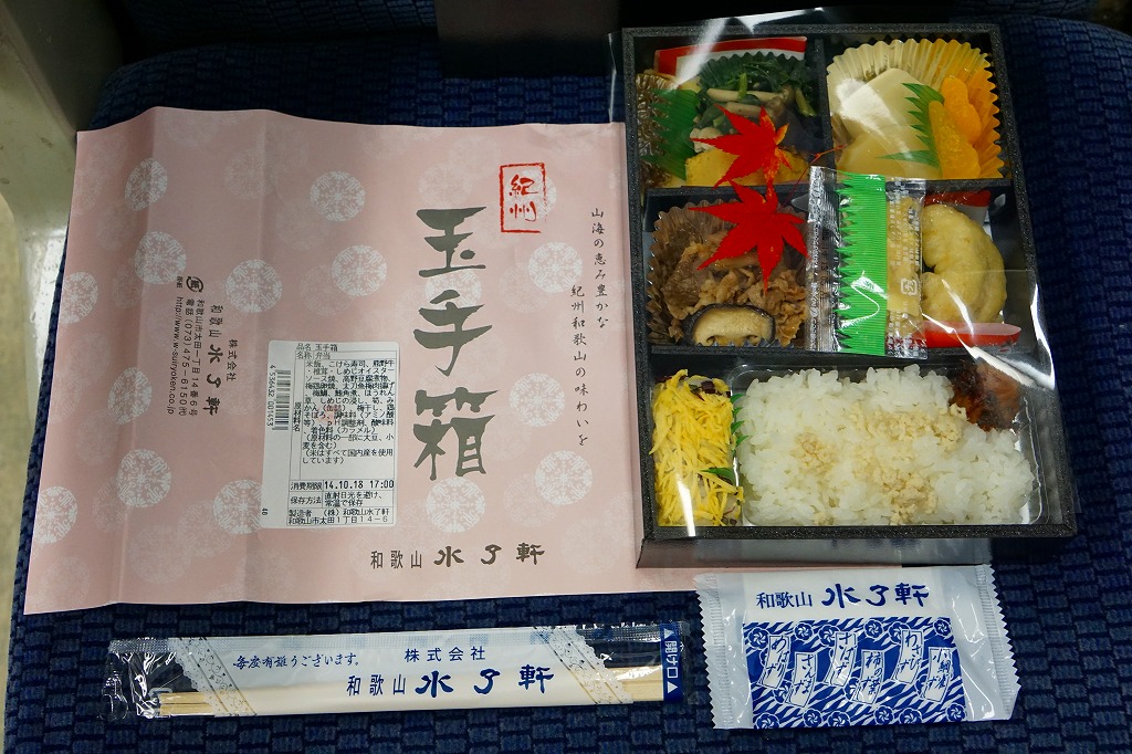 2011(平成23)年までに1,200円で発売か。大きく見える長方形の容器に、白飯とこけら寿司、梅鶏卵焼と太刀魚梅肉揚、牛肉煮とシイタケ、マグロ角煮としめじのおひたし、高野豆腐とみかんなど。「紀州和歌山の味わい」であってもなくても、高級な折詰だと思う。後にこれが「紀州玉手箱 ぎん」(1,500円)となり、他に「紀州玉手箱 きん」(2,000円)が出た模様。