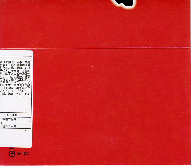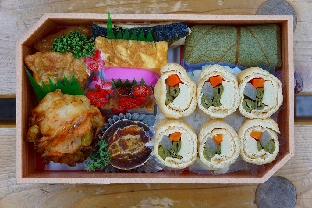 中身は白飯の上に「田舎巻き」なる高野豆腐やインゲンなどの油揚げ巻きが6個と、すり身揚げ、湯葉包み、鶏照焼、焼サバ、かまぼこ、玉子焼、菊花などの柿の葉ずし1個、ゆず柿など。食材の内容も形も並べ方も、千円以下の駅弁なのにとてもきれい。食べた後に四方紅の敷紙が底から出現し、高級感がぐっと増した。2017年の初頭頃までの販売か。