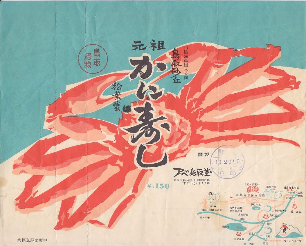 1960年代の、10月20日10時の調製と思われる、昔の鳥取駅弁の掛紙。上記の1963年のものと同じ、鳥取駅弁「元祖かに寿し」の掛紙や包装の絵柄は、当時も今も変わらない。こちらには「特製」の文字がない。