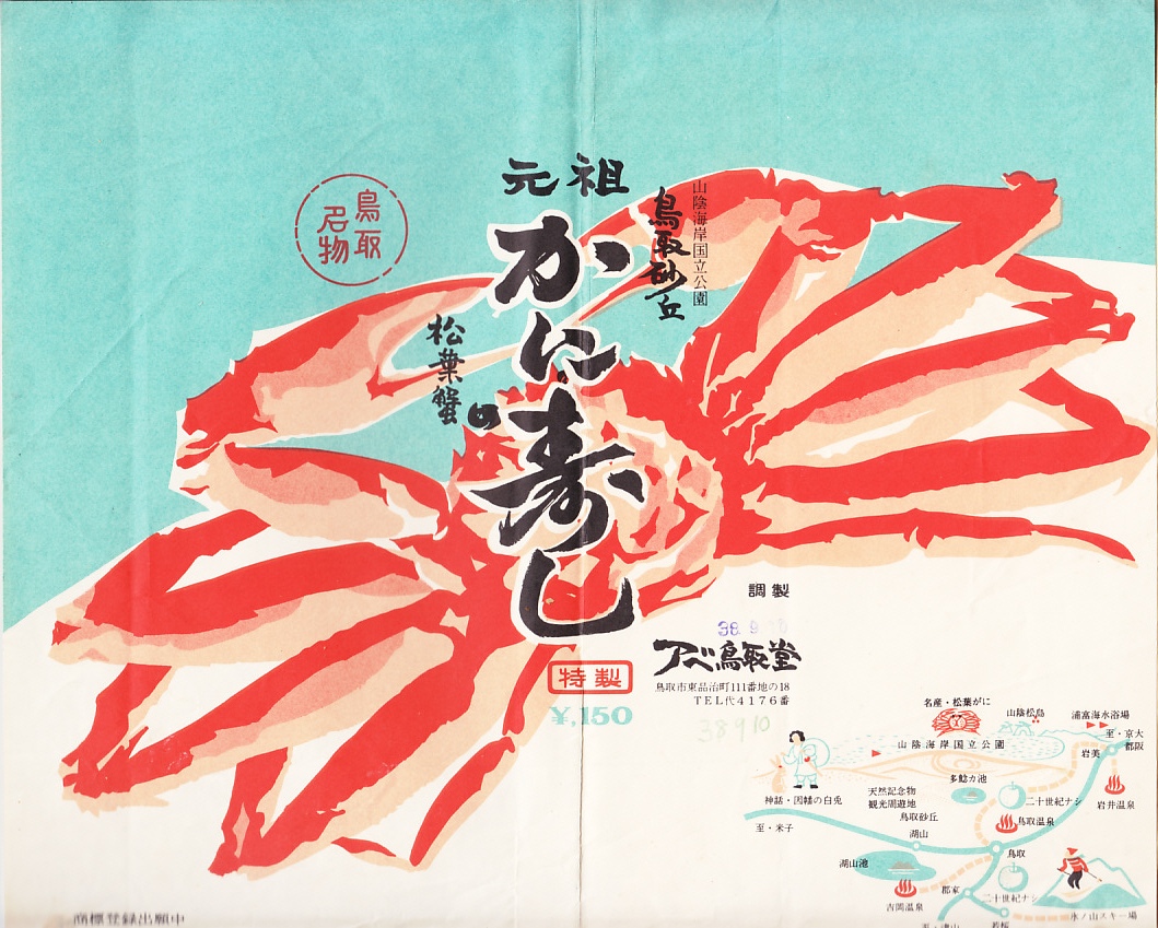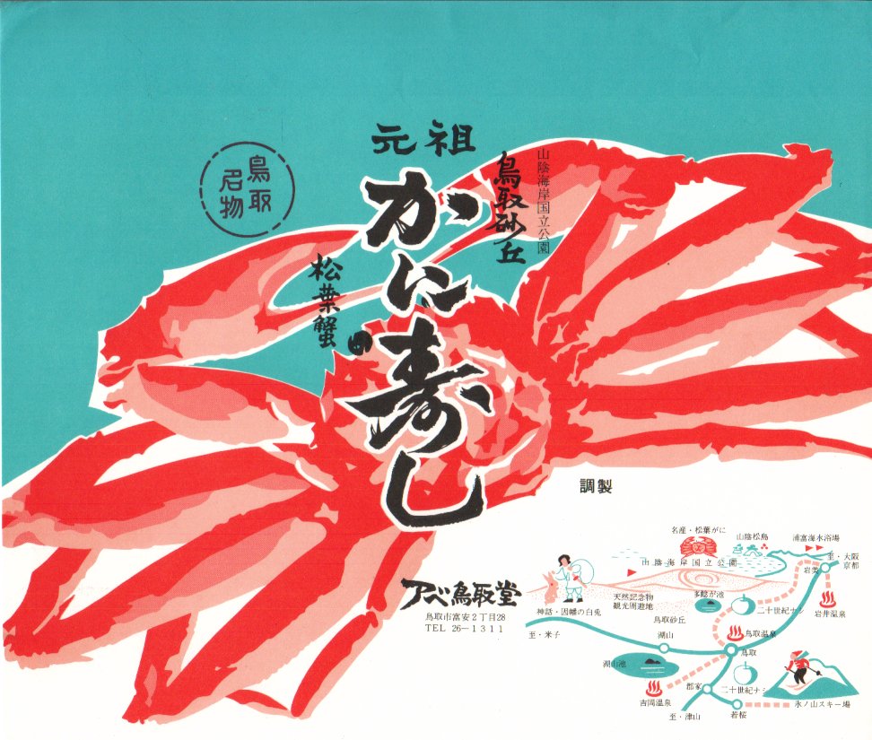 入手状況等から1977(昭和52)年のものと思われる、昔の鳥取駅弁の掛紙。中身は現在の「元祖かに寿し」と同じだと思われる。掛紙にはカニ駅弁だからと松葉蟹が描かれ、その隅には観光イラストマップが載るという、当時の駅弁掛紙デザインの王道を行く。